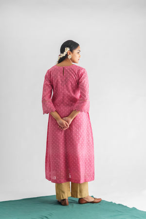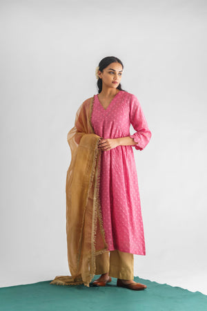 This chanderi silk kurta is a stunning piece in a lovely shade of pink. The self-flower motif adds an extra touch of elegance to the garment. The side panels of the kurta are adorned with detailed gathers, while the V-neck features intricate bead and sequin work on the chest. The three-quarter sleeves are finished with scallop edging and bead and sequin detailing, making it the epitome of sophistication. Comes with a slip.
