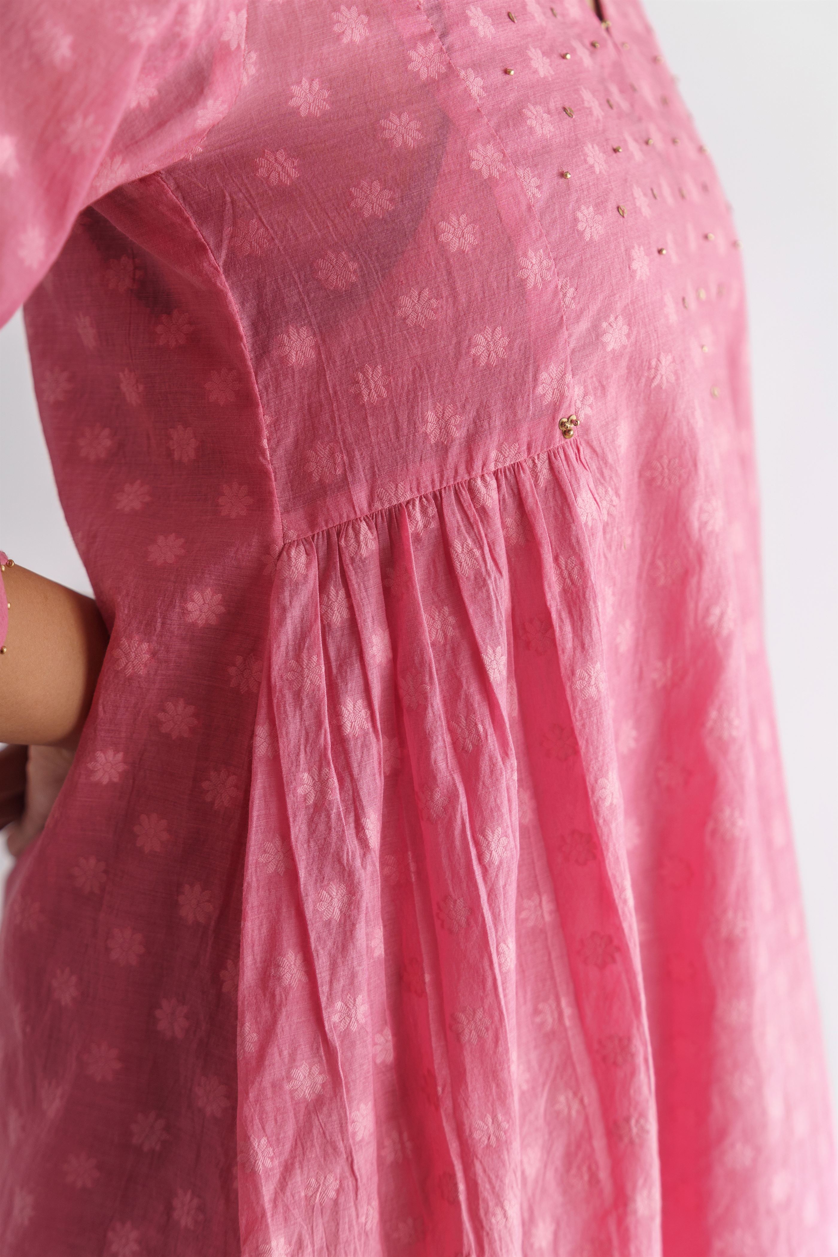 This three-piece set includes a kurta(with a slip), pants and a dupatta. This chanderi silk kurta is a stunning piece in a lovely shade of pink. The self-flower motif adds an extra touch of elegance to the garment. The side panels of the kurta are adorned with detailed gathers, while the V-neck features intricate bead and sequin work on the chest. The three-quarter sleeves are finished with scallop edging and bead and sequin detailing, making it the epitome of sophistication. Pants are made with silk brocade fabric and organza dupatta with lace edging.