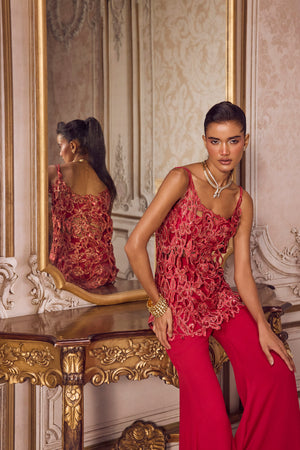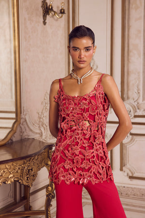 Magenta floral kurta with our signature floral cut-work embroidery. It comes with a bustier with the sheer cutwork top which is highlighted with cutdana, zari, dori and sequins. It is paired with georgette kalidar pants