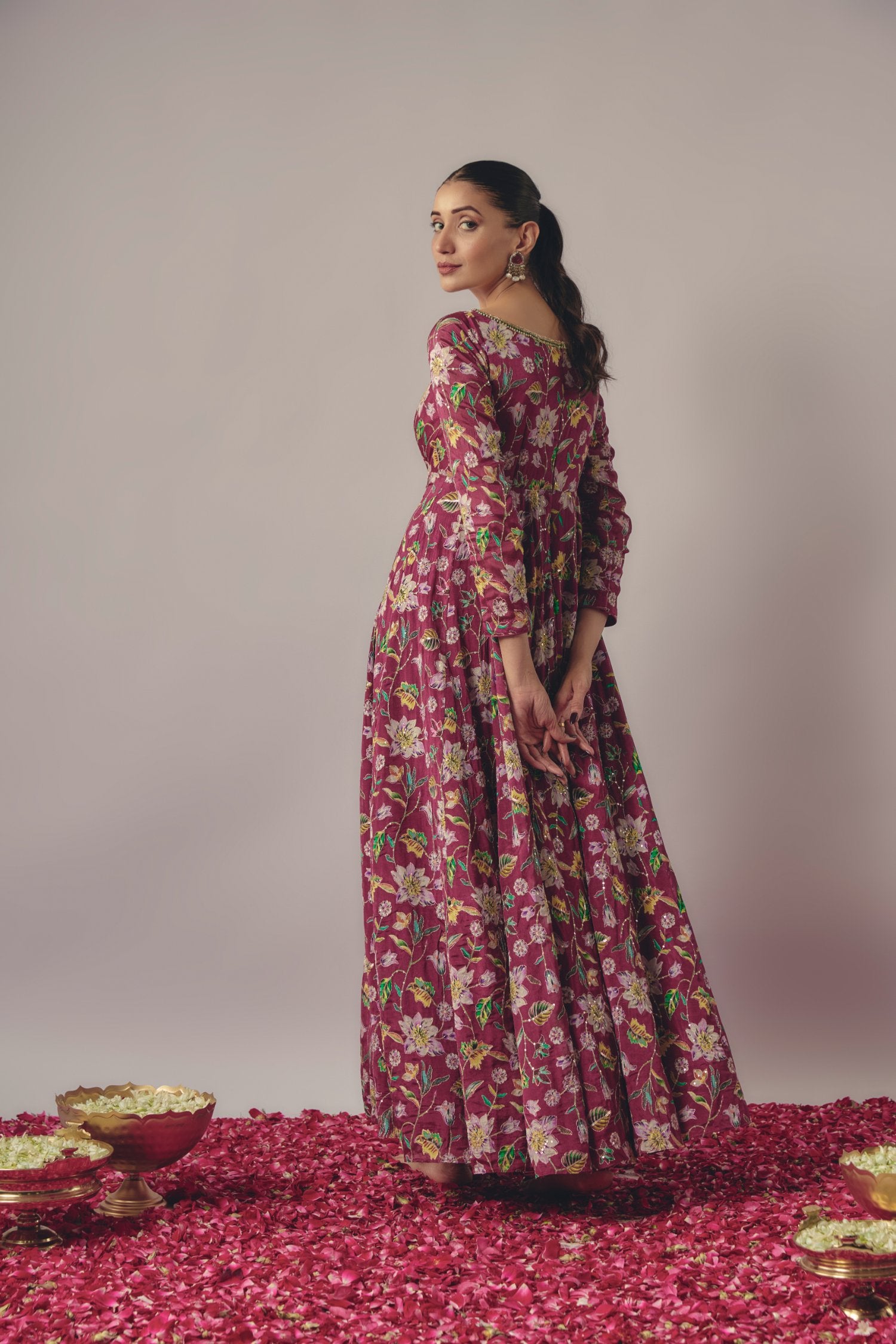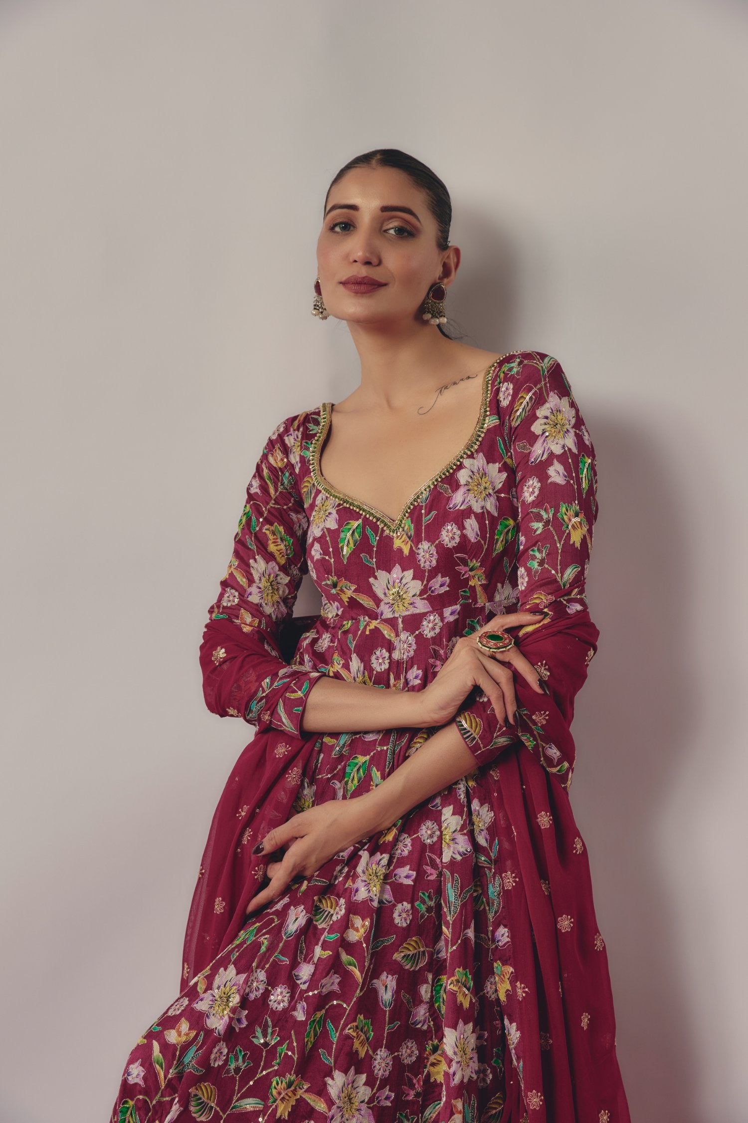 Featuring a magenta floral anarkali in chinon base with hand embroidery. It is paired with matching lycra legging and dupatta. Accentuate it with statement jewellery and heels for a festive occasion or wedding ceremony.