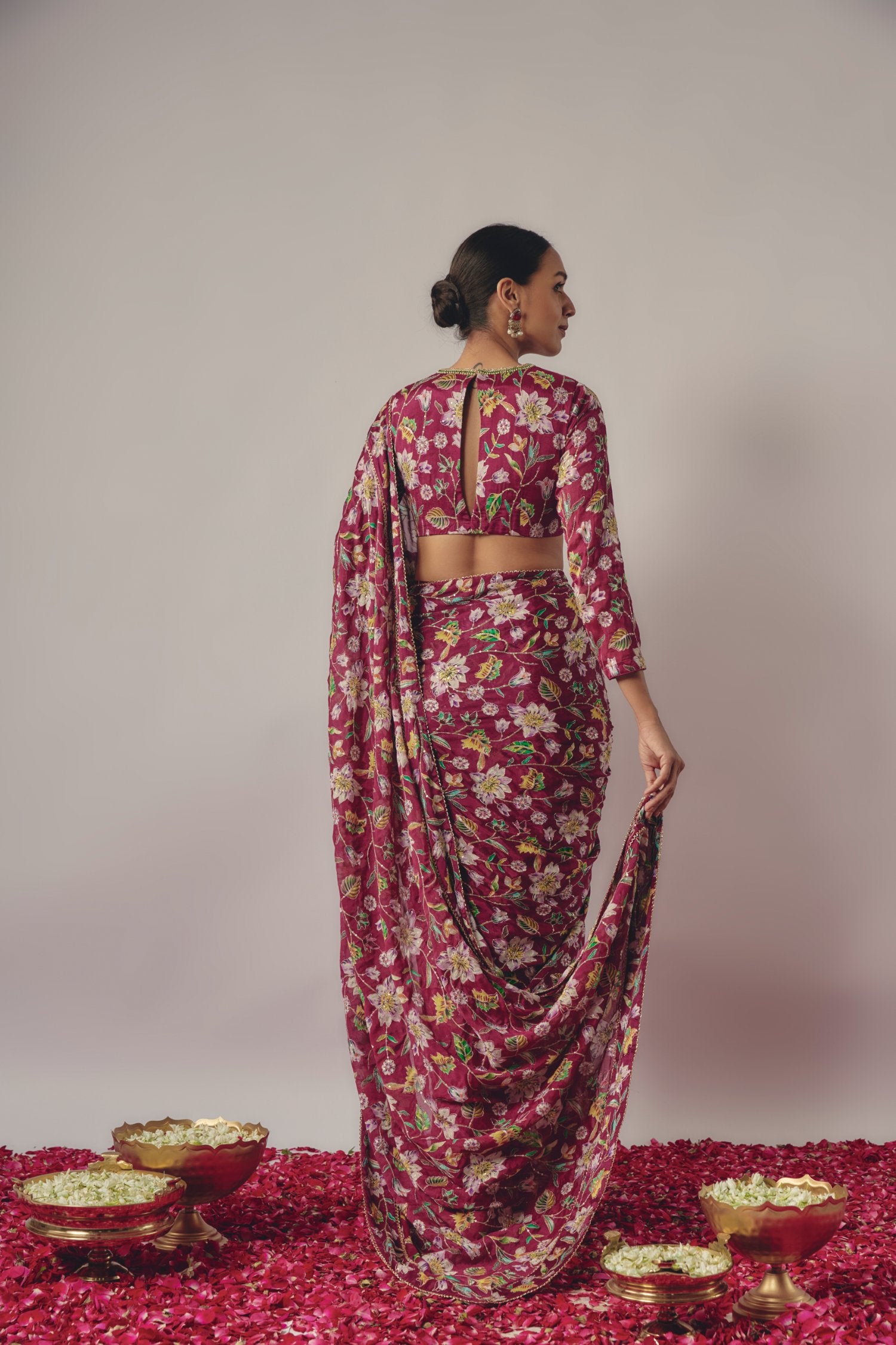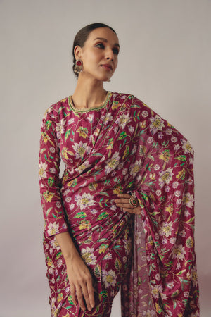 Featuring a magenta embroidered pre- draped saree in chinon silk base with floral print. It is paired with matching embroidered blouse.
