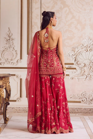 A pure silk organza halter neck kurta and sharara with a Dori and aari embroidered short kurta adorned with sequins, cut dana, bead, mirror, zardozi. It is paired with matching sharara with scattered floral embroidery and zig-zag pattern on hem. It comes with a sheer net dupatta with embroidered borders.