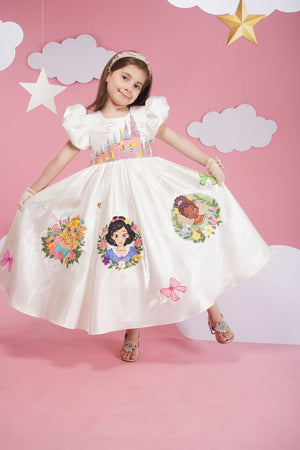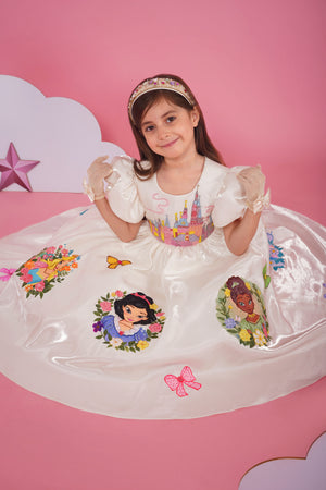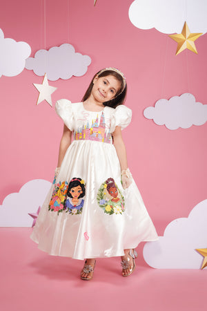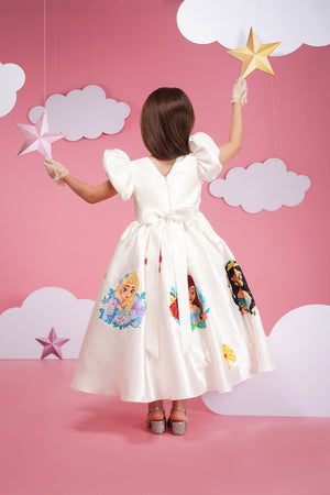 A beautiful white lequid satin organza dress with hand painted princess theme, pearl & sequin detailing on the paint with puffed sleeves