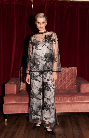 Introducing our embroidered mesh lace co-ord set, a masterpiece of elegance and charm. This ensemble is adorned with intricate lace detailing, adding a touch of timeless beauty to your outfit
