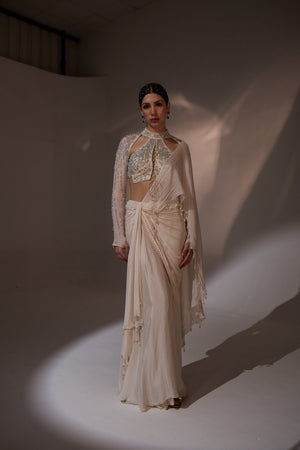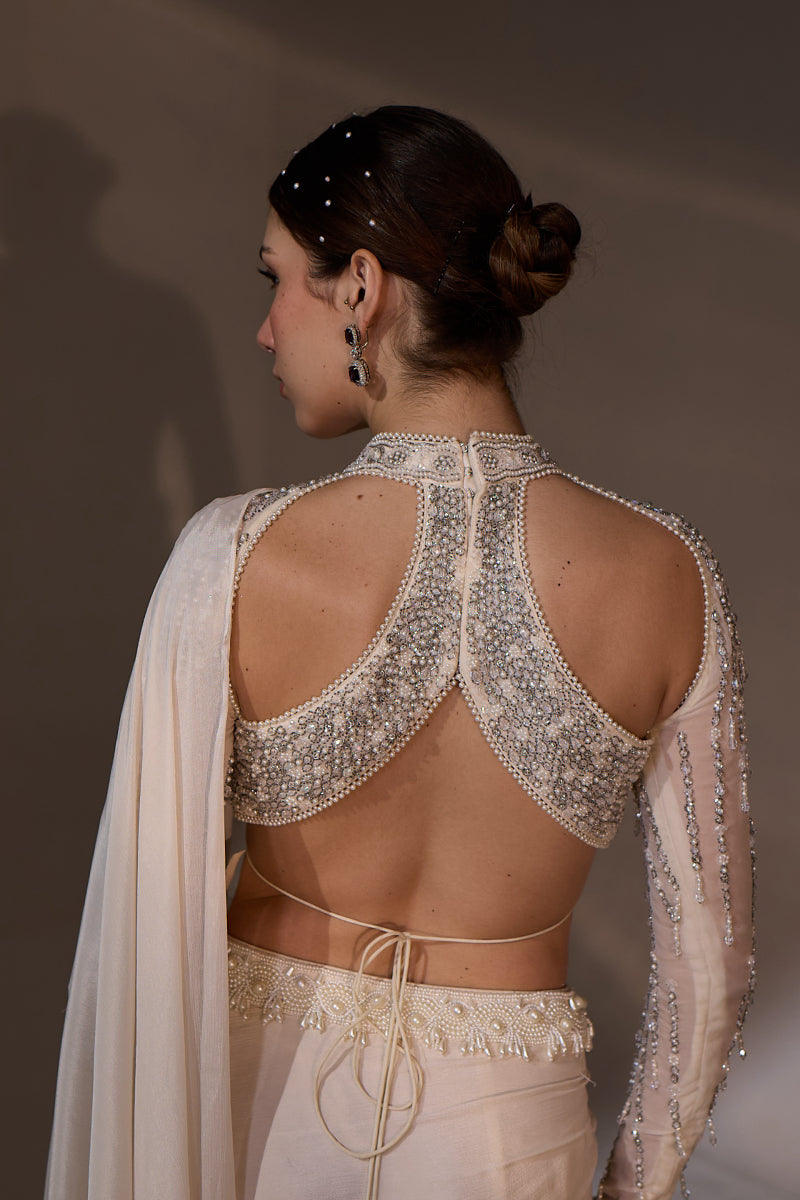 This statement drape saree reimagines tradition with a contemporary twist — featuring a front palla drape that adds fluidity and drama. It’s paired with a full-sleeve blouse tailored with modern, edgy cuts and detailed with meticulous aari hand embroidery and crystal embellishments.