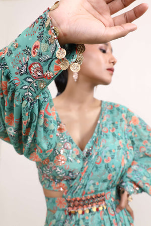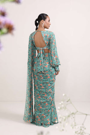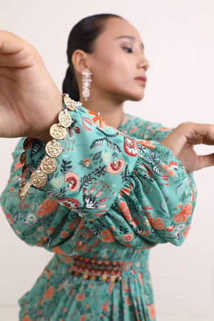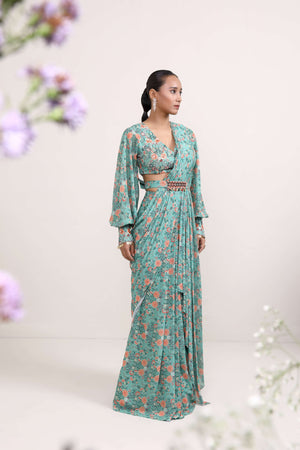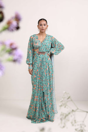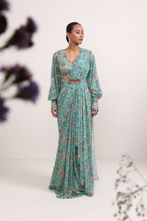 The saree features a captivating boho print with motifs that seamlessly blend shades of green and orange. These two contrasting yet complementary colors create a visually stunning effect. The motifs on the saree are a delightful mix of traditional and contemporary elements, incorporating geometric patterns, floral designs, and abstract shapes creating eclectic look that captures the essence of bohemian fashion. The blouse features a balloon sleeves and a V-neckline. And a belt cinched with an embroidery patch at the center
