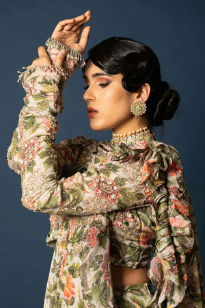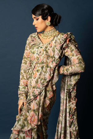 This vintage royal floral print pre-drape saree with a heavily embroidered blouse is pure maharani vibes. Luxurious fabrics, intricate embroidery, and regal colors make it fit for a queen. Get ready to turn heads and feel like royalty!