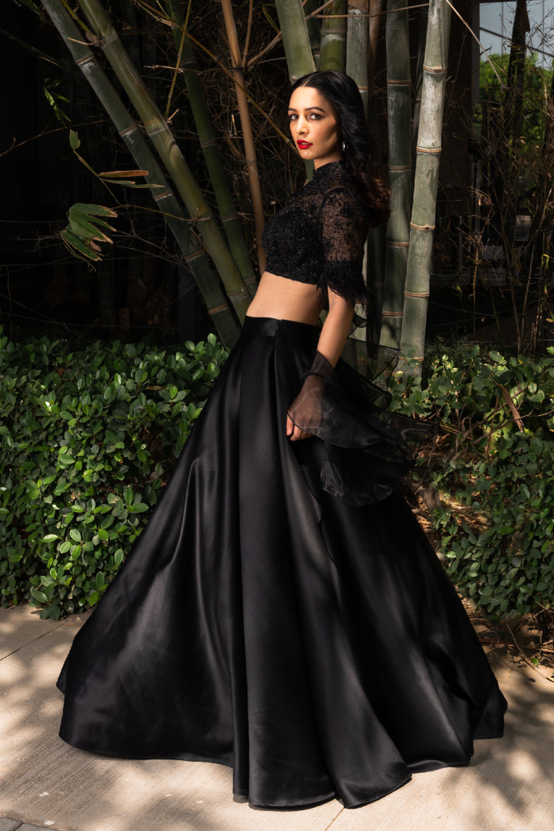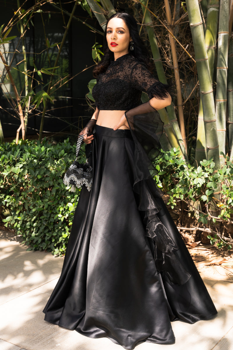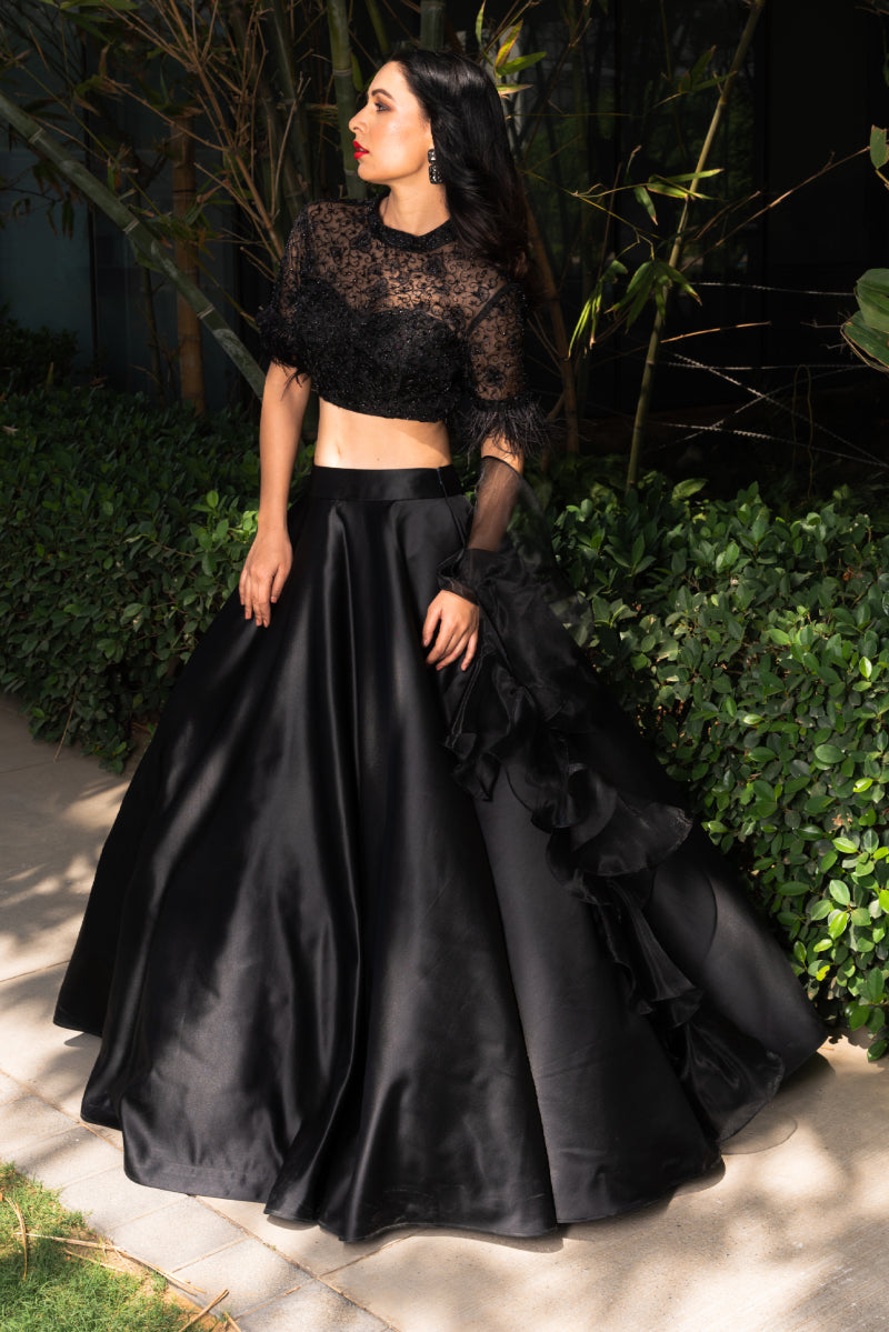 Black Silk Organza Blouse paired with Organza Lehenga and Organza Ruffle Dupatta