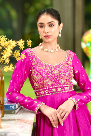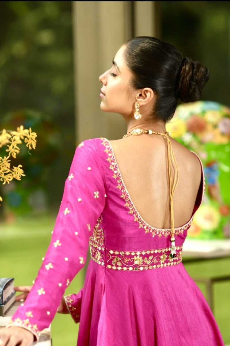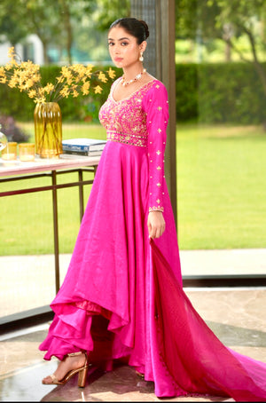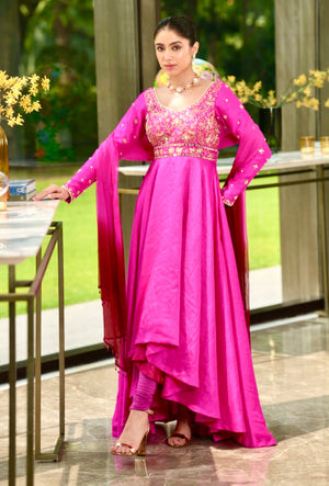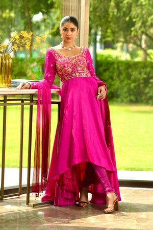 Hand embroidered nyasa silk asymmetrical anarkali with votton lycra churidaar and ombre dyed chiffon dupatta with tassel detail