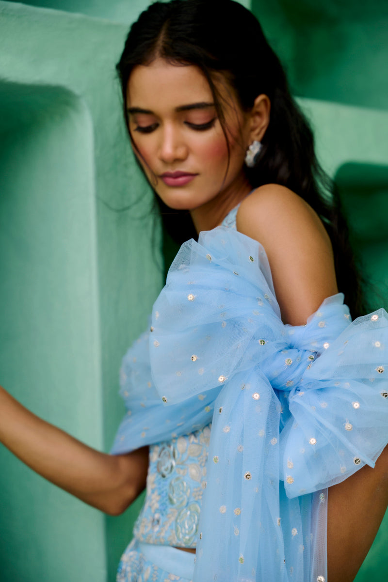 Floral thread and faux metallic leather embroidered halter neck top and flared pant paired with tulle dupatta.