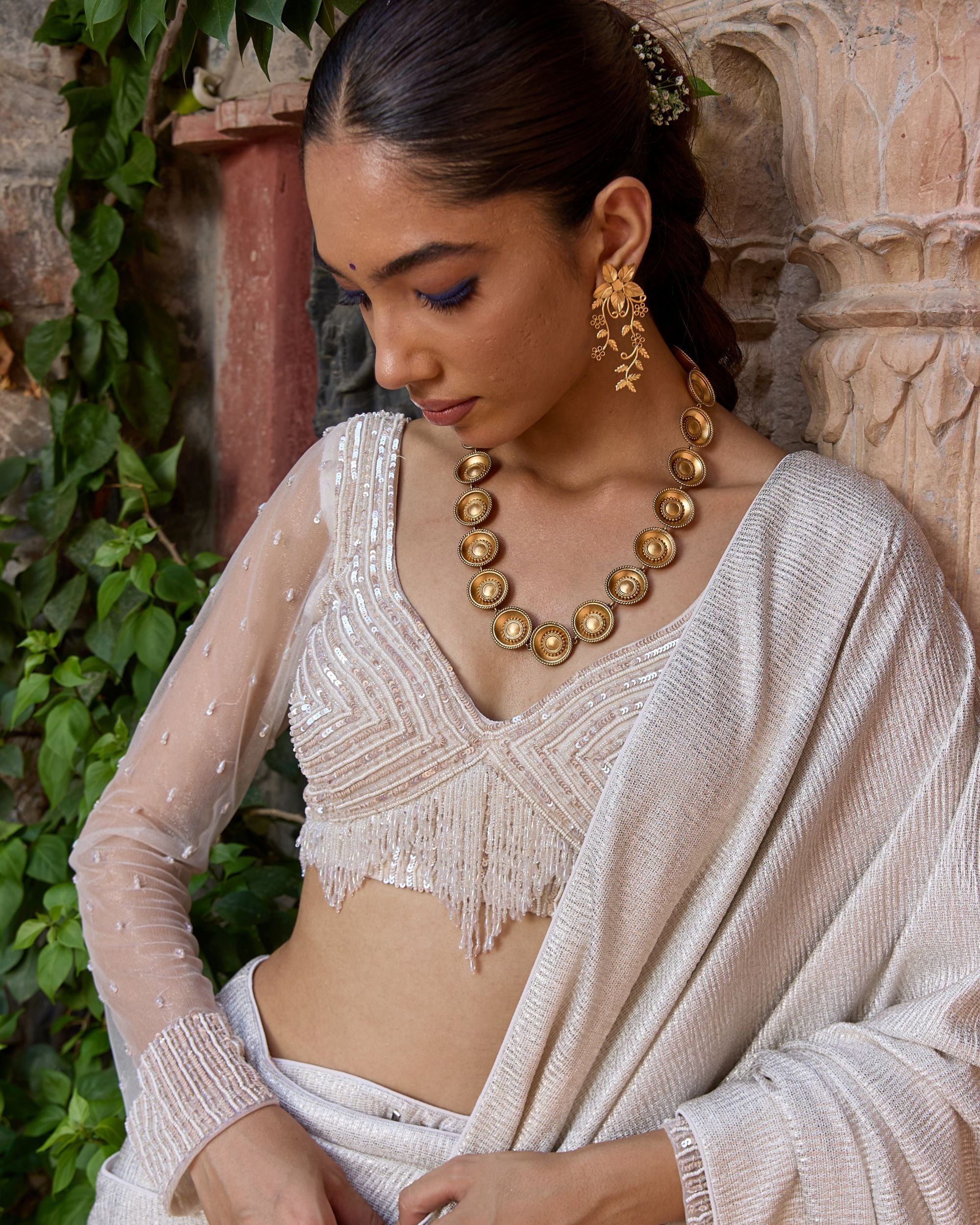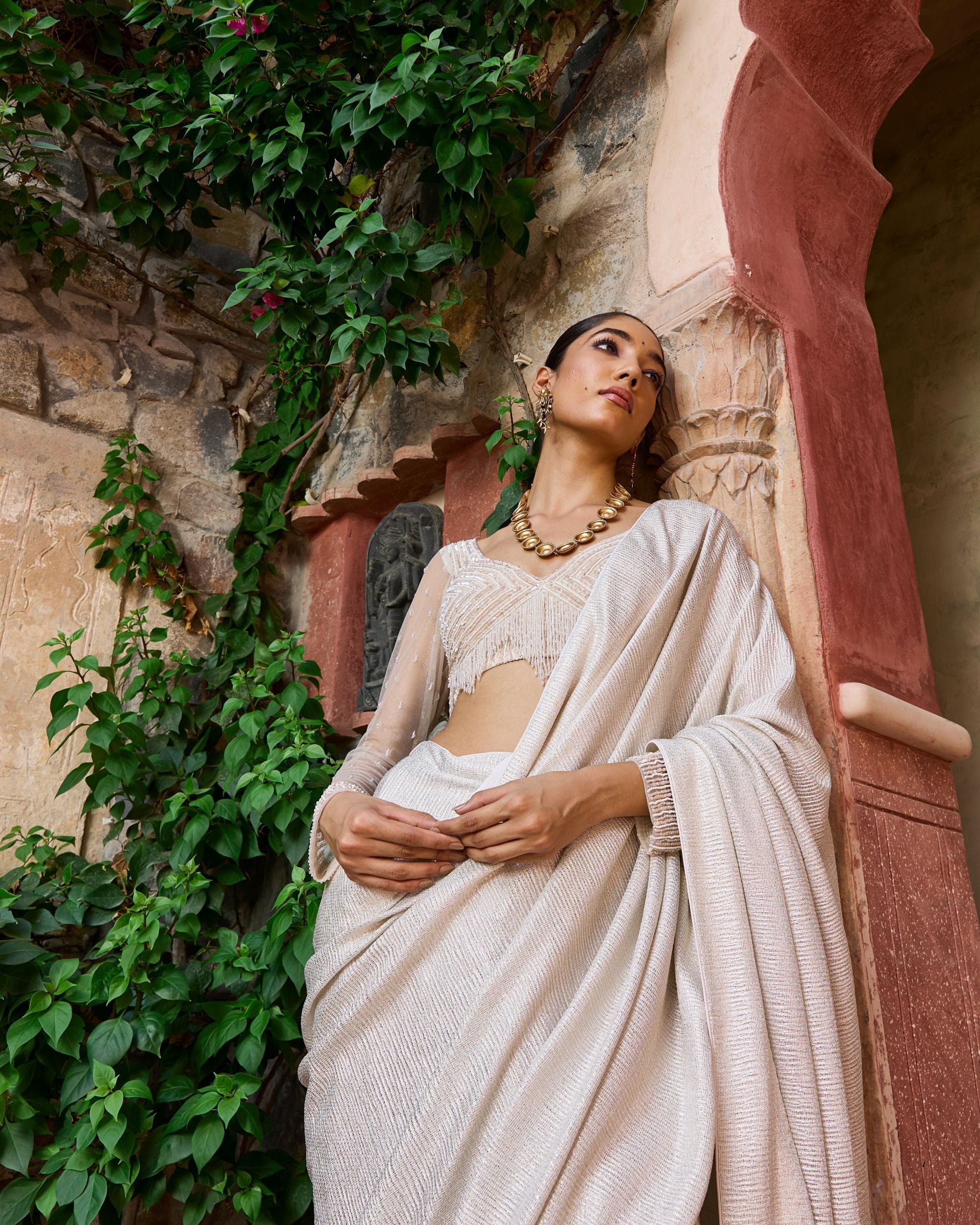 A pre-draped saree that blends ease with elegance, featuring a hand-embroidered blouse with sheer detailing.