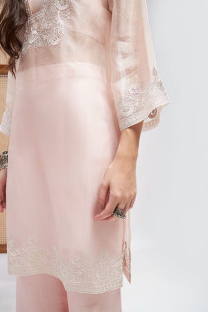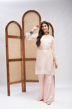 Pastel Pink co-ord set with tonal pants and embroidered kurta shrug
