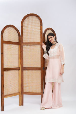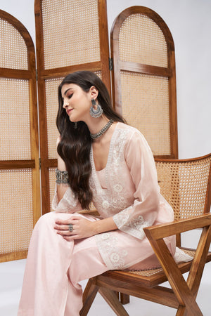 Pastel Pink organza co-ord set with tonal flared pants. The blouse and pants come with fine mulmul lining and a beautifully embroidered organza kurta shrug. Our pants are impeccably tailored for a sleek and flattering look, ensuring that you look effortlessly chic.