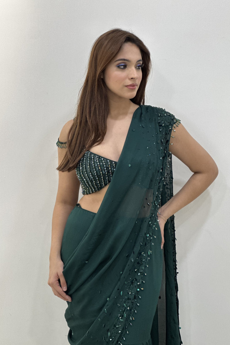 Grace meets modernity in this green pre-draped layered skirt saree, perfect for effortless elegance.