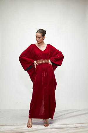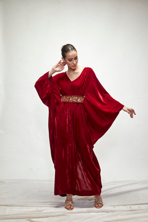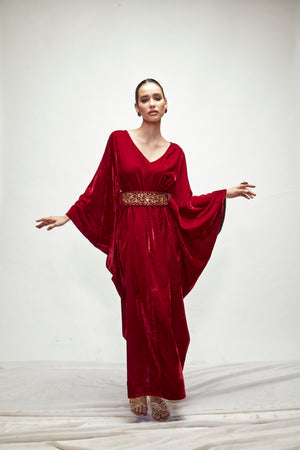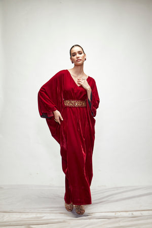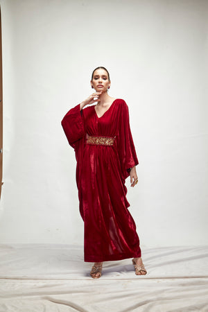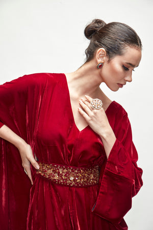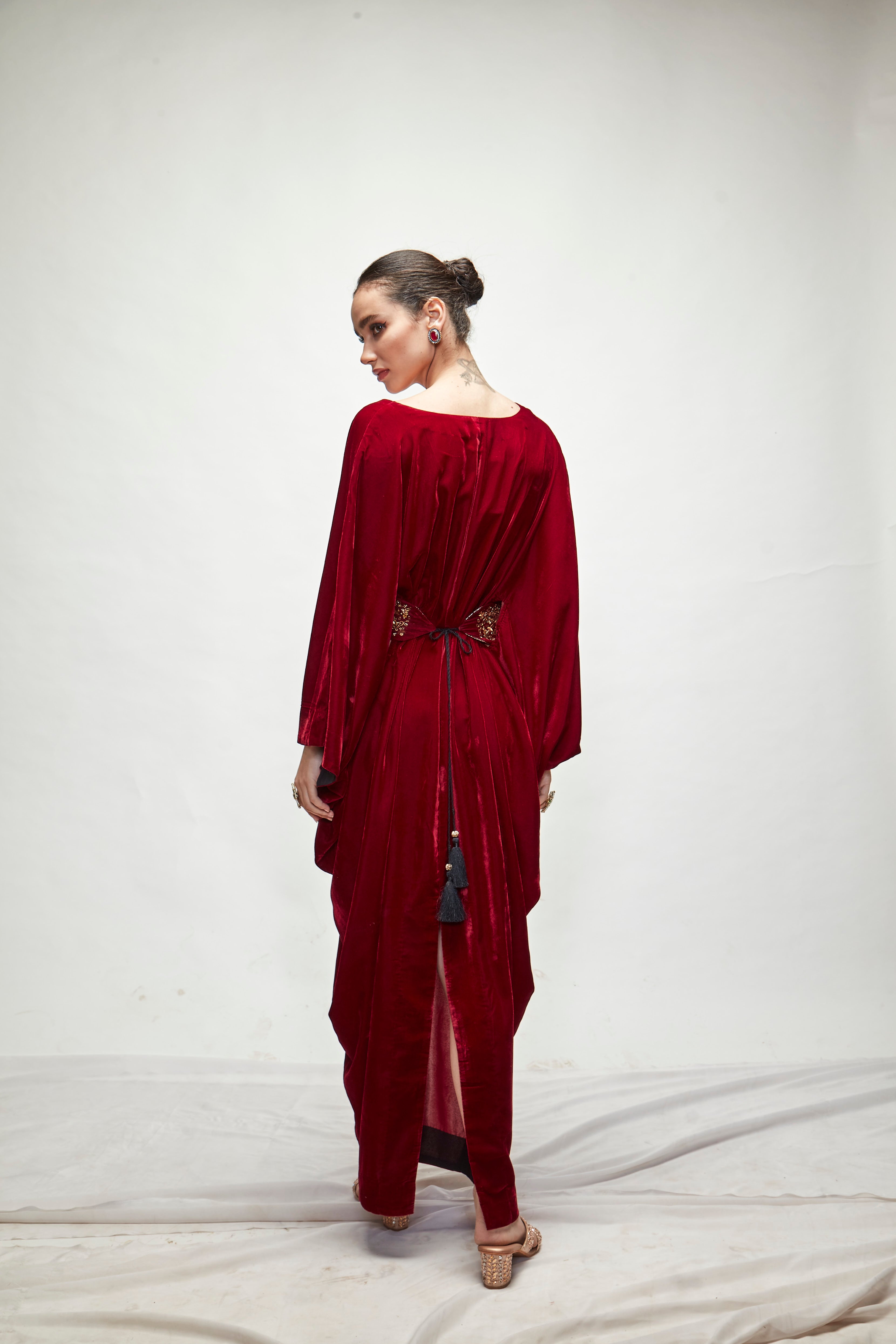 Velvet Kaftaan With Extended Cowl On The Sides For A Relaxed Fit. Back Slit For Ease In Walking. Zardosi Embroidered Belt Complete The Emsemble.
