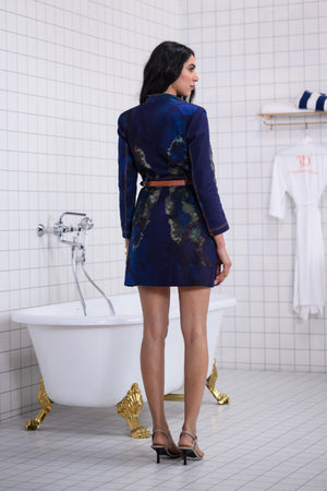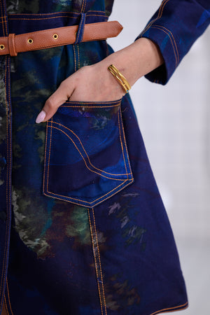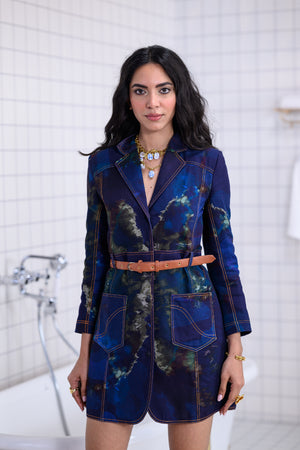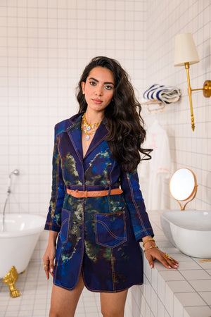 The perfect fusion of power dressing and artistic elegance, this tailored blazer dress redefines bold sophistication. Designed for the modern muse who embraces structure with a hint of drama, this piece is crafted from a deep indigo cotton base, that bring an ethereal charm to its structured silhouette. The sharp lapel collar and precise panel stitching elevate its strong, tailored form, while contrast topstitching in a striking tan hue adds an unexpected element of utility chic. The structured shoulders and tapered long sleeves enhance the powerful yet polished aesthetic, making this dress a statement in refined confidence. The double front pockets add both functionality and effortless cool, while the adjustable tan leather belt cinches the waist beautifully, defining your curves while keeping the look sleek and elevated.