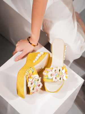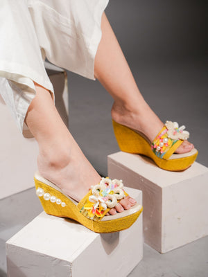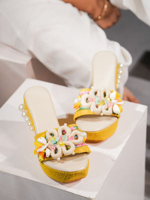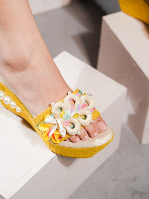Laid on a mustard-ish jute base and finished with the same. Call this out for your colorful ocassional pairings. The sides are accentuated with pearls making it a delicate statement piece.