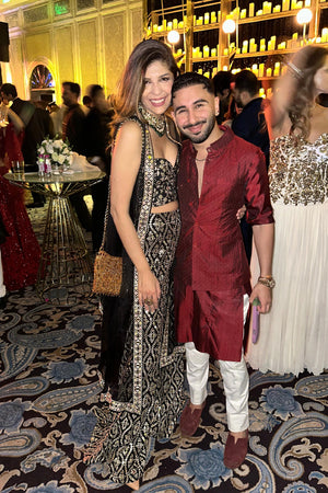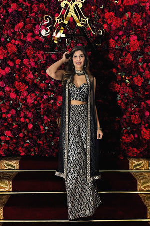 This co-ord set features sweetheart blouse embellished with intricate work . The high-waisted flared pants are covered in geometric pattern.Completed with a cape, adorned with delicate embroidery and border, adding an elegant touch.