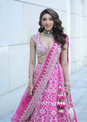 The ensemble includes a heavily embellished blouse with a deep neckline and off-shoulder straps. The lehenga showcases an elaborate pattern of threadwork and mirror details, paired with an organza dupatta adorned with matching embroidery and delicate borders.