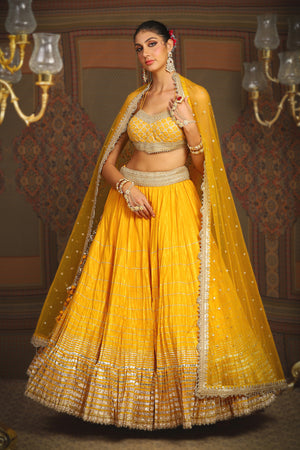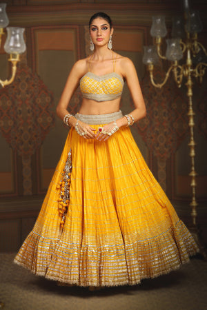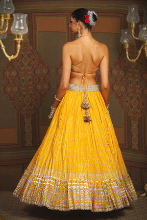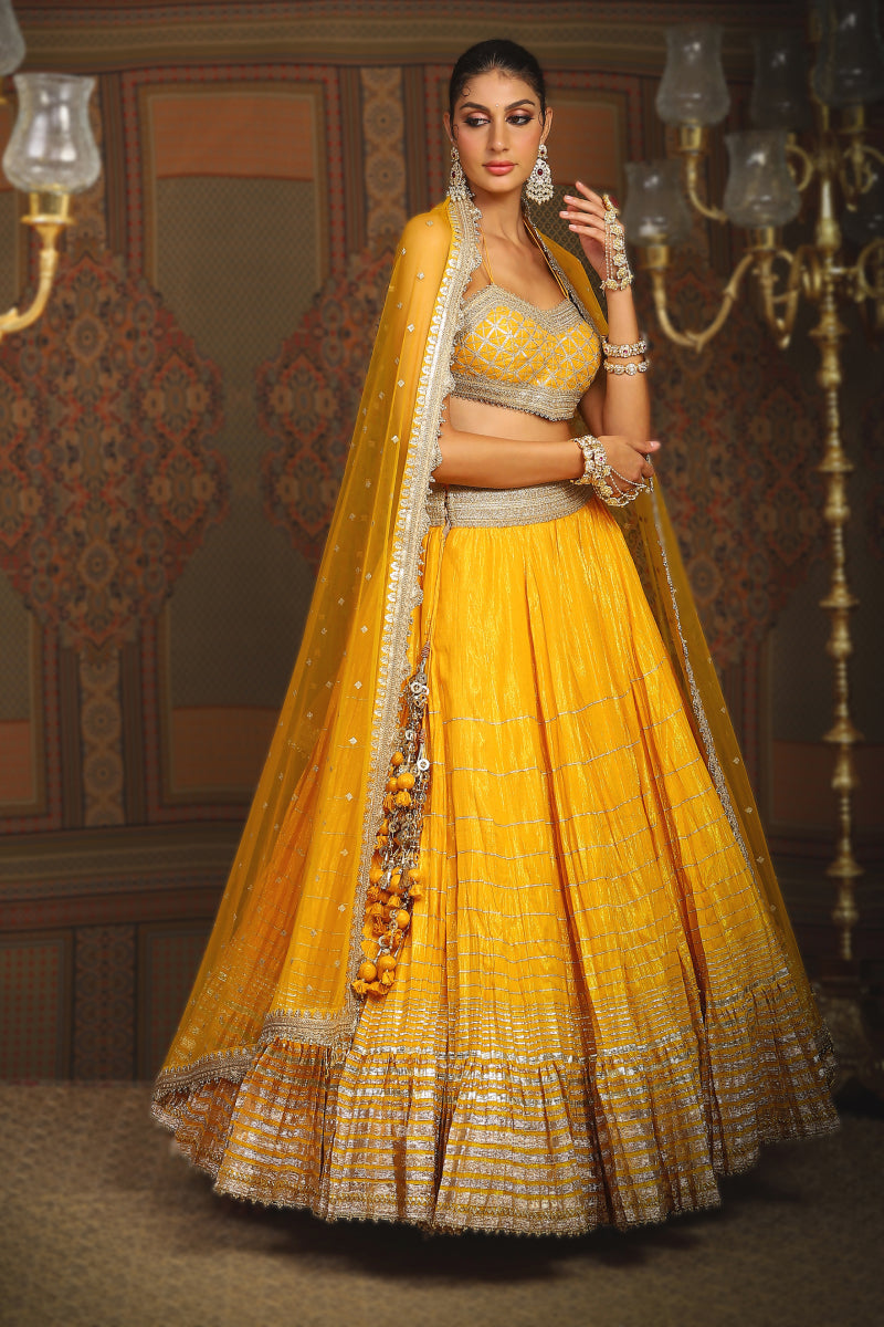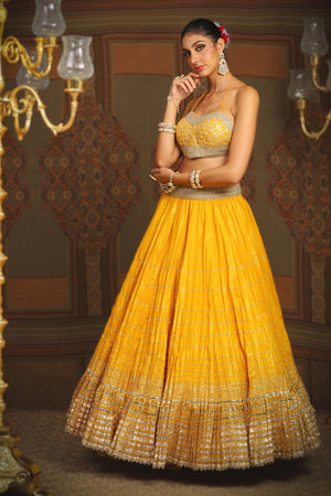 Radiate Youthful Vibrance In Our Shimmer Chanderi Crinkle Lehengas, Embracing The Enchanting Shades Of Mango Yellow Embellished With Fine Gota Work. The Ensemble Is Complemented By A Flowing Net Dupatta. The Blouse, Boasting Chic Noodle Straps, Elegantly Frames One’S Shoulders, Exuding Modern Grace. This Ensemble Resonates With The Dynamic Energy Of Youth, Making It An Irresistible Choice For Girls Who Seek A Blend Of Tradition And Contemporary Allure.
