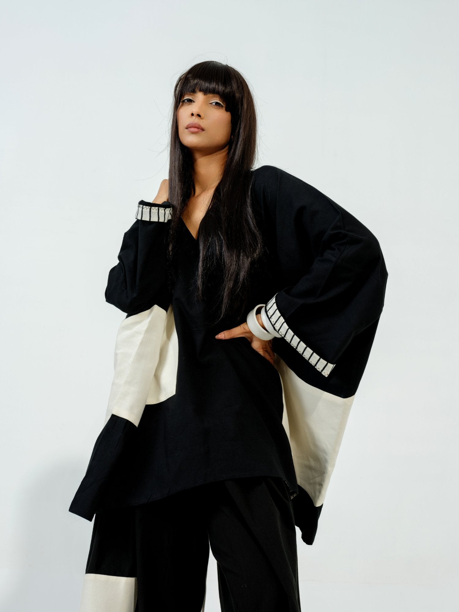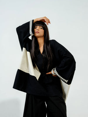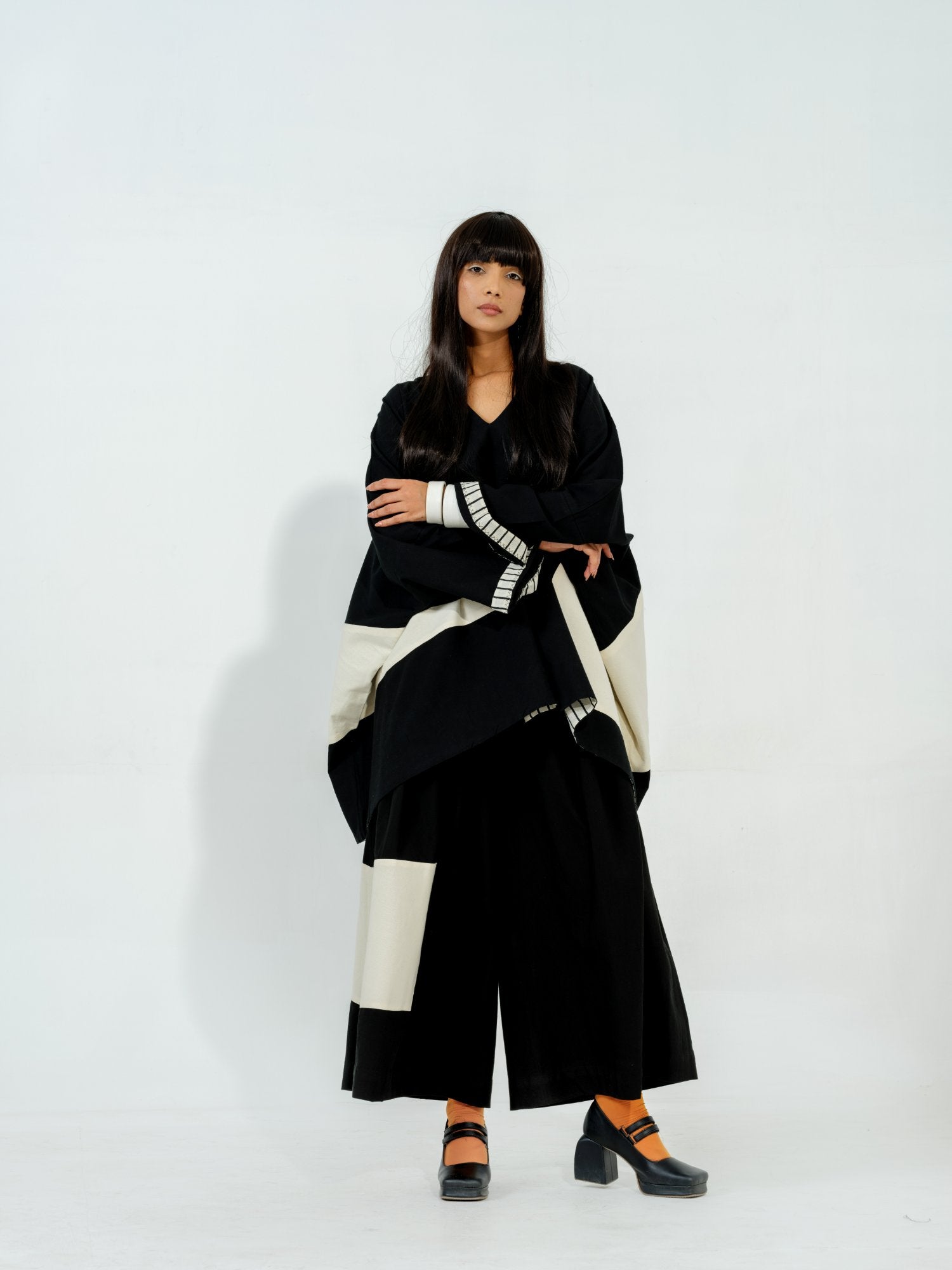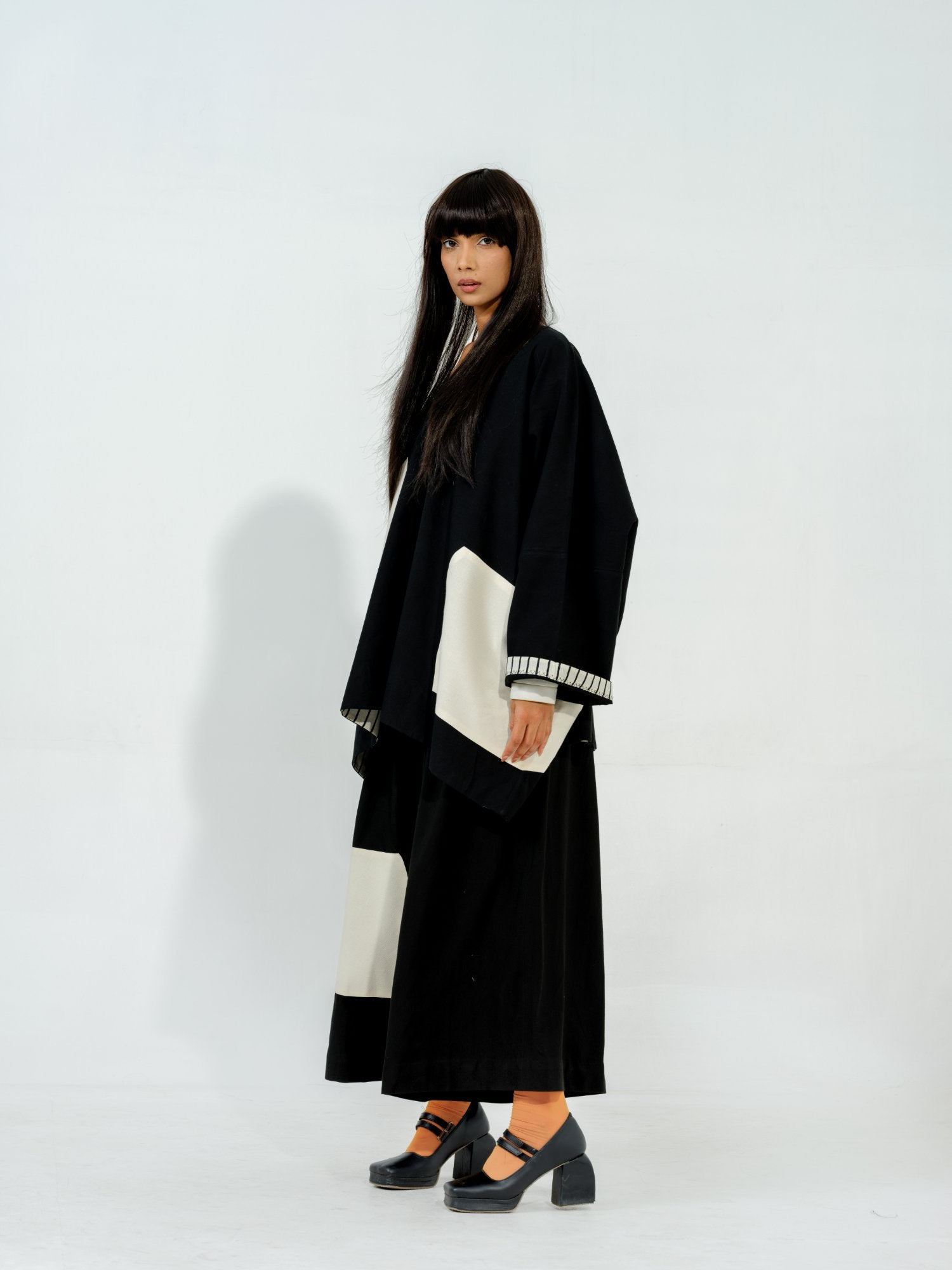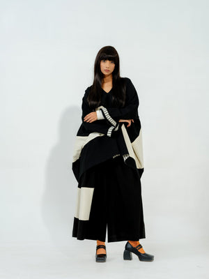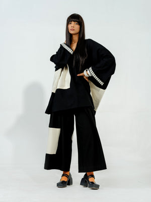 Flared pants with pleats on the waistband with a hand sewn geometric appliqué and elasticised waist band for ease of wearing