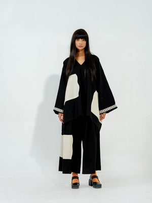 A Free size mid length top with kimono style sleeves and a geometric appliqué in cotton meticulously sewn by hand & contrasting facings on the hem and sleeves and a blazer style collar
