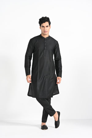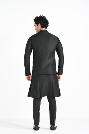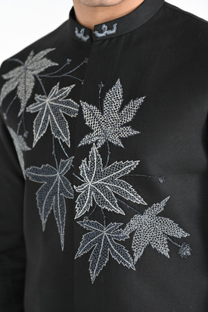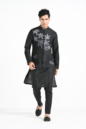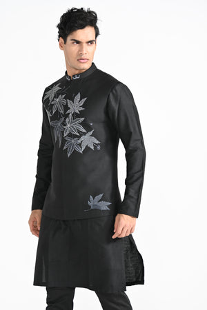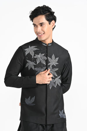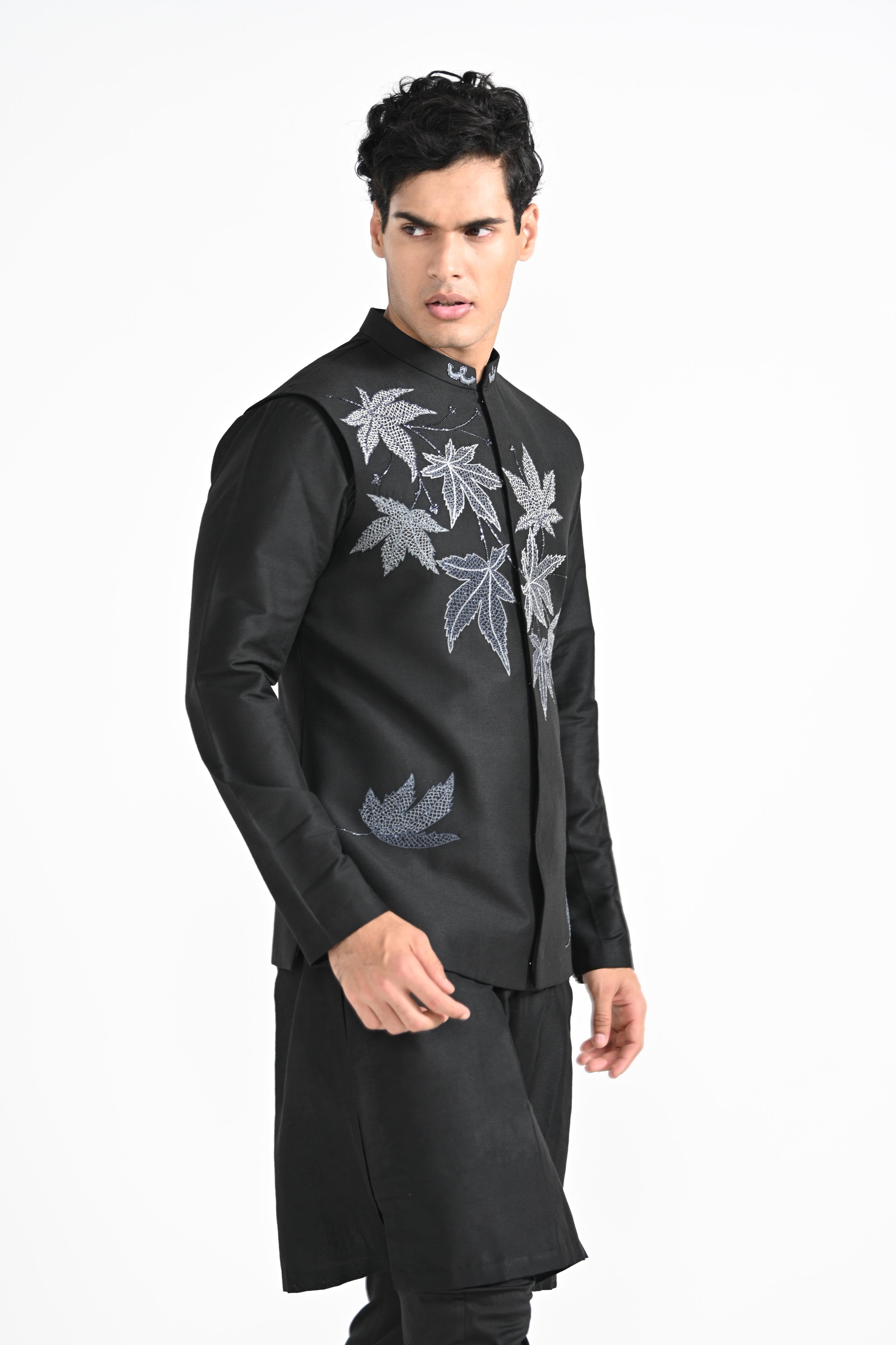 Black Bamberg raw silk nehru higlighted with maple leaf embroidery using cudaana and thread work. Paired with black plain kurta and Black slim fit Pant Pajama. Color of the actual garment may vary due to lighting conditions during the shoot .