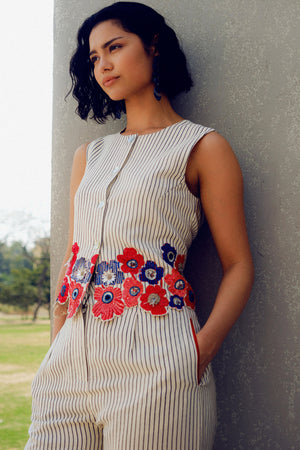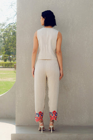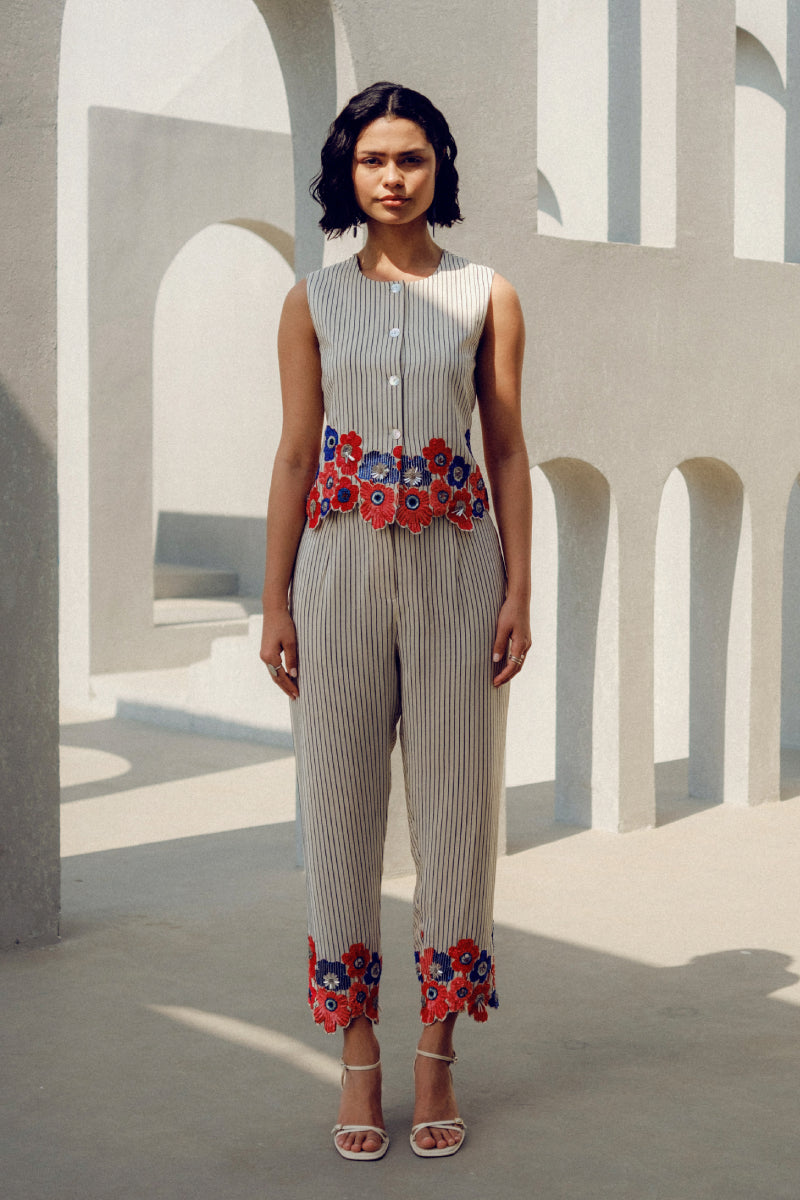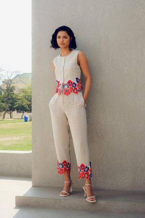 The Margot waistcoat co-ord set is made of pure crepe. It features delicate floral embroidery and sequins detailing at the hemline of the shirt and trousers.