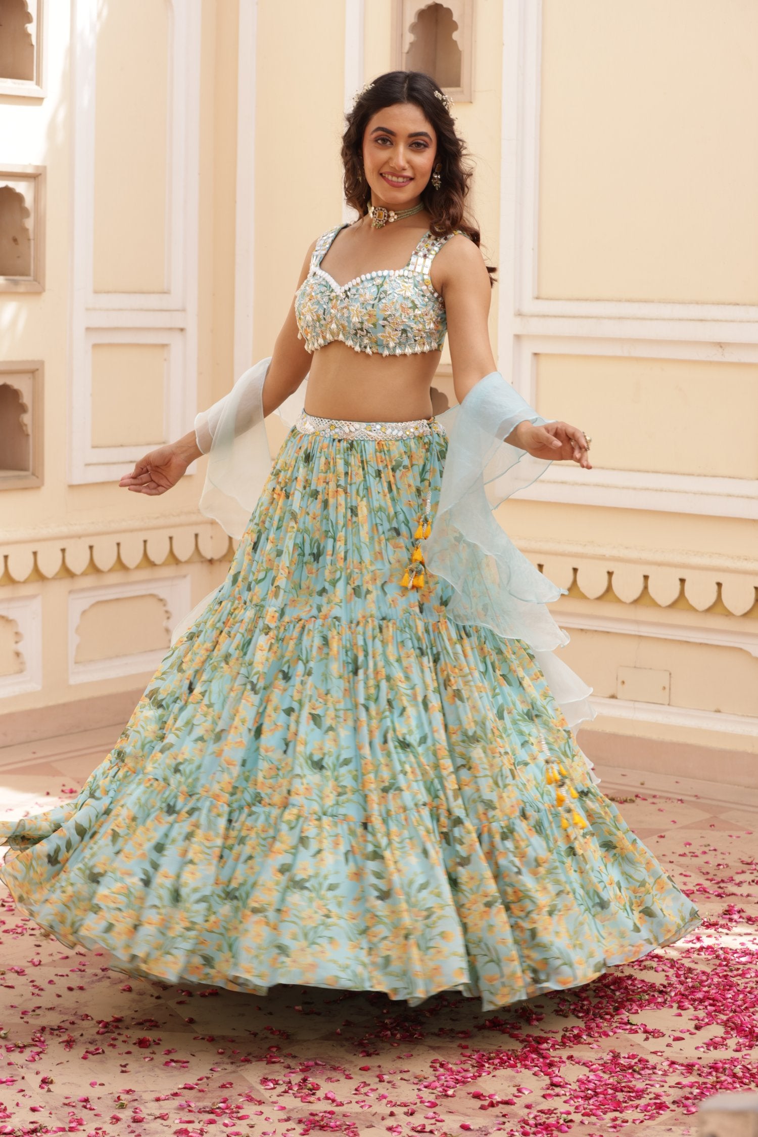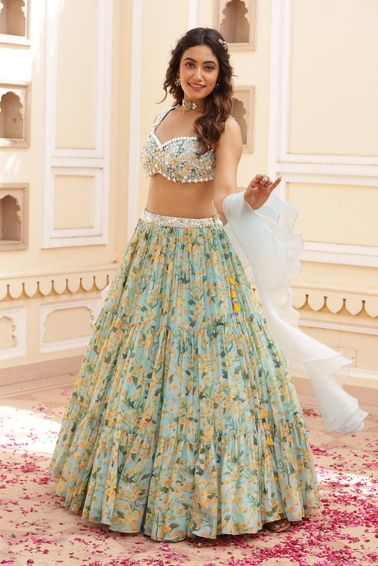 Chiffon Three tier lehenga with embroidered belt. Paired with beatuifully hand embroidered blouse with pearls, Katana and many more materials. Comes along with Organza shaded double ruffled dupatta