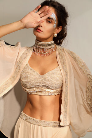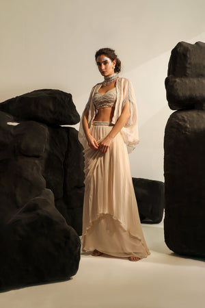A draped skirt in muted peach hues efforlessly synchronises with intricate embroidery on a panelled blouse to form the Maribelle drape. As graceful as it is elegant, this ensemble is synonymous with opulence- making it one-of-a-kind.