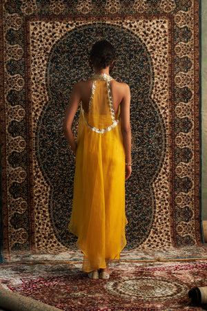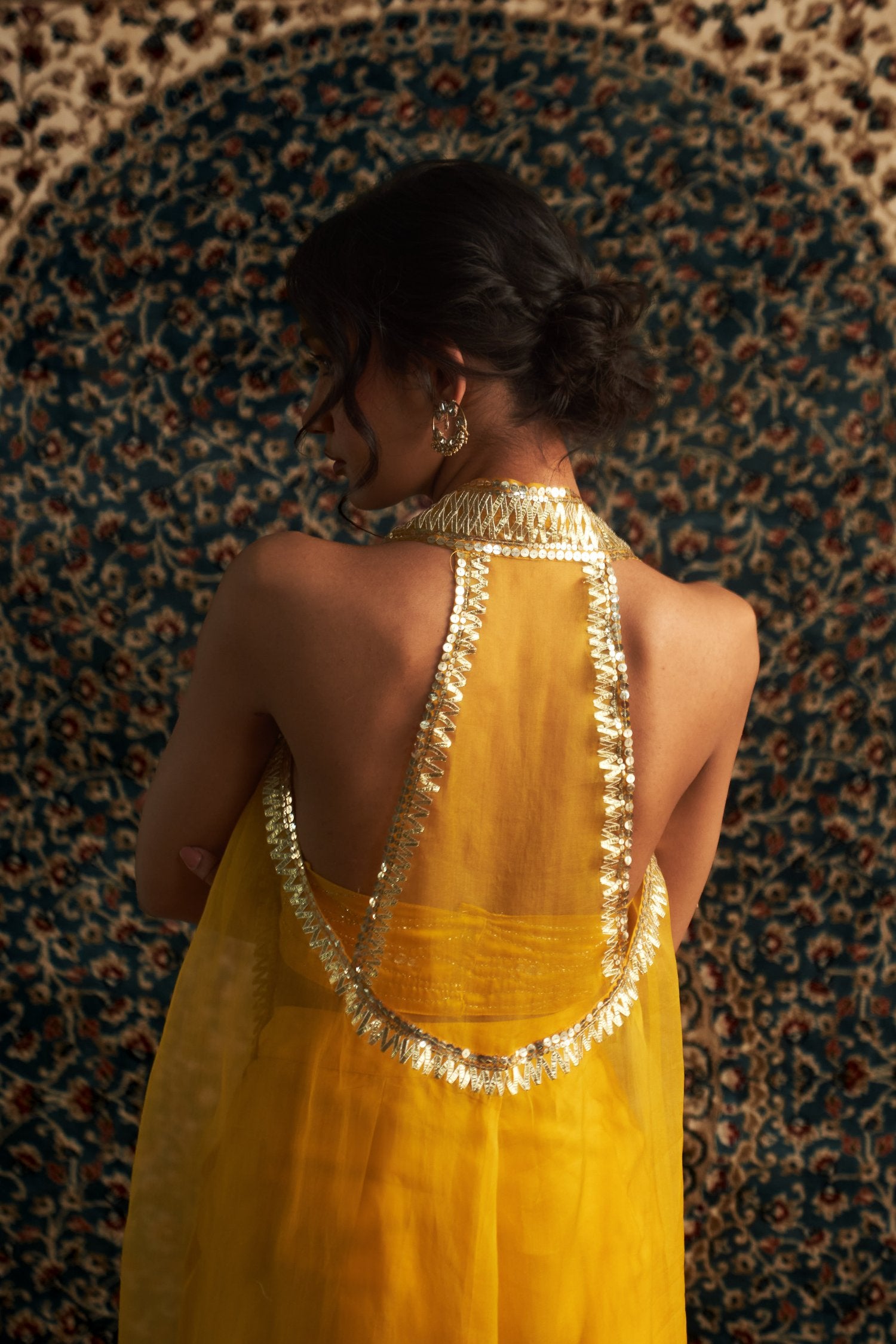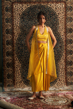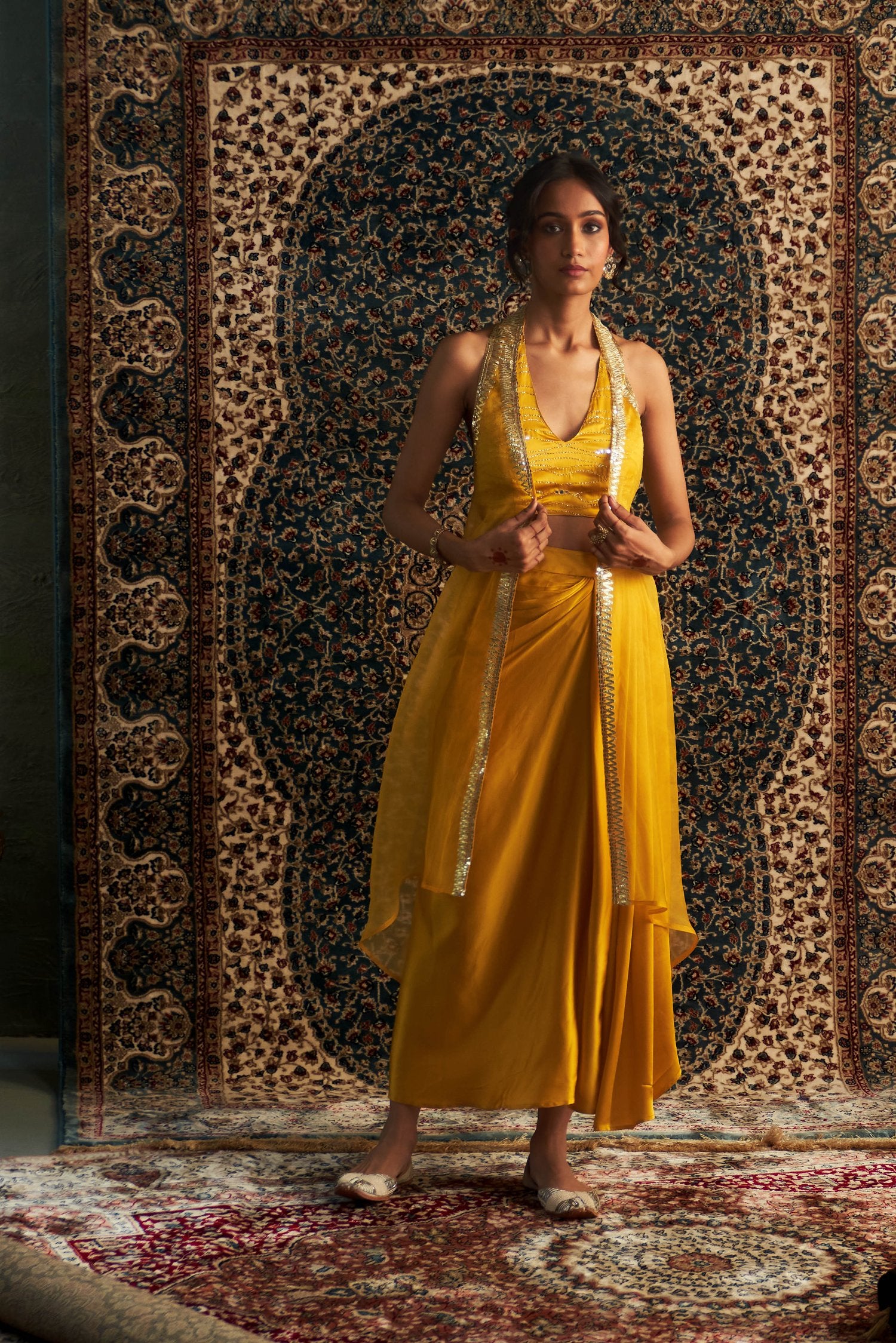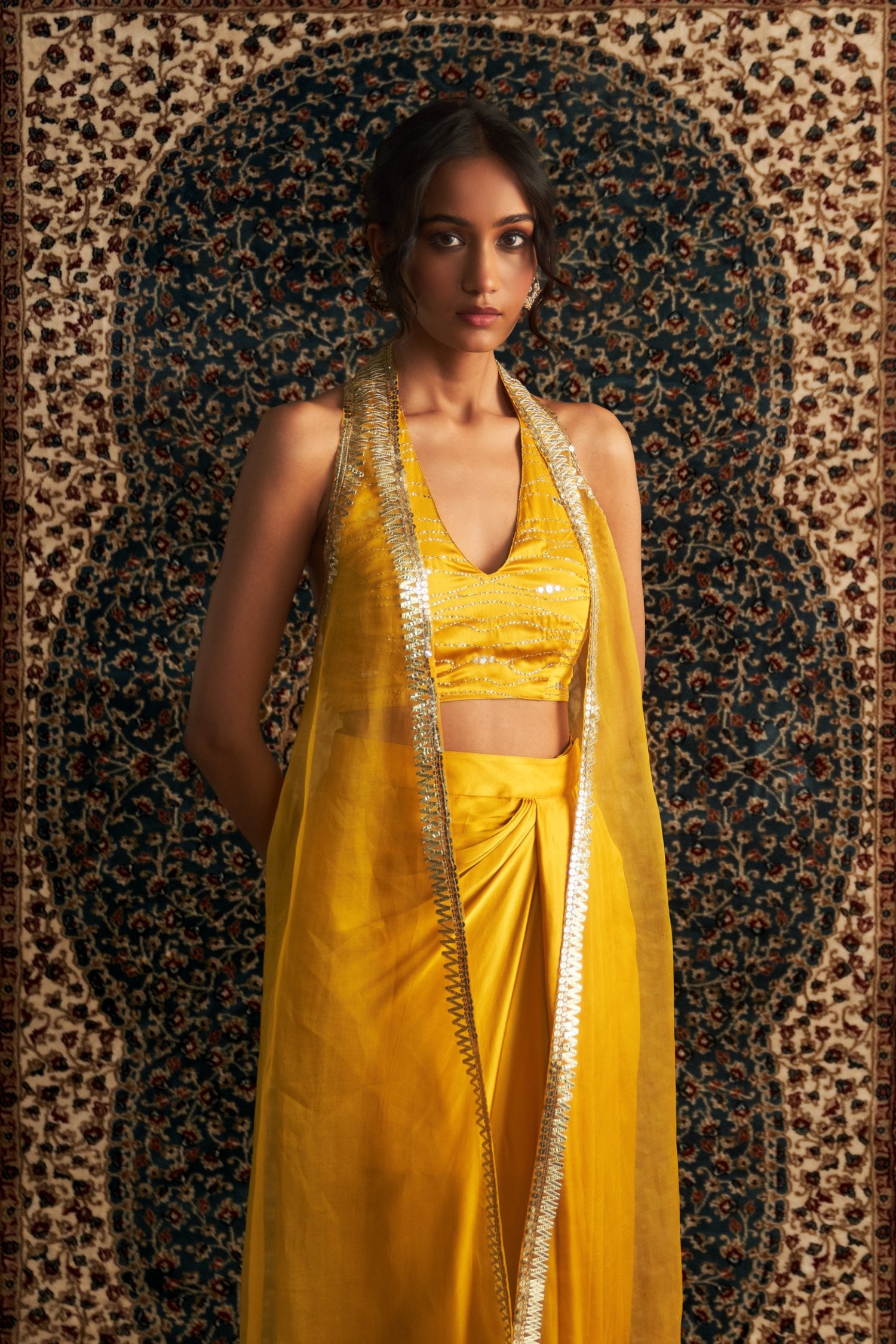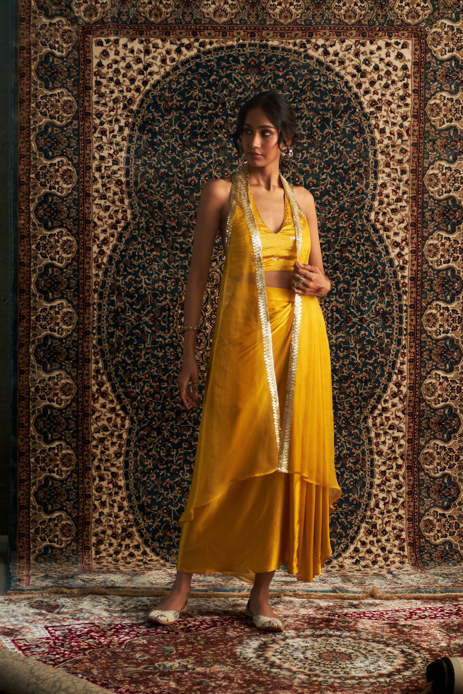 This ensemble is the epitome of elegance for any special occasion, featuring a fully embroidered marigold halter neck top paired with a beautifully draped skirt and a sleeveless sheer organza overlay enriched with an ornate border for a touch of opulence. The fluid silhouette of the draped skirt gracefully accentuates every movement, perfectly complementing the intricate craftsmanship of the top. Designed to make a bold statement, this outfit seamlessly blends timeless luxury with modern sophistication, ensuring you captivate attention while exuding confidence and charm.