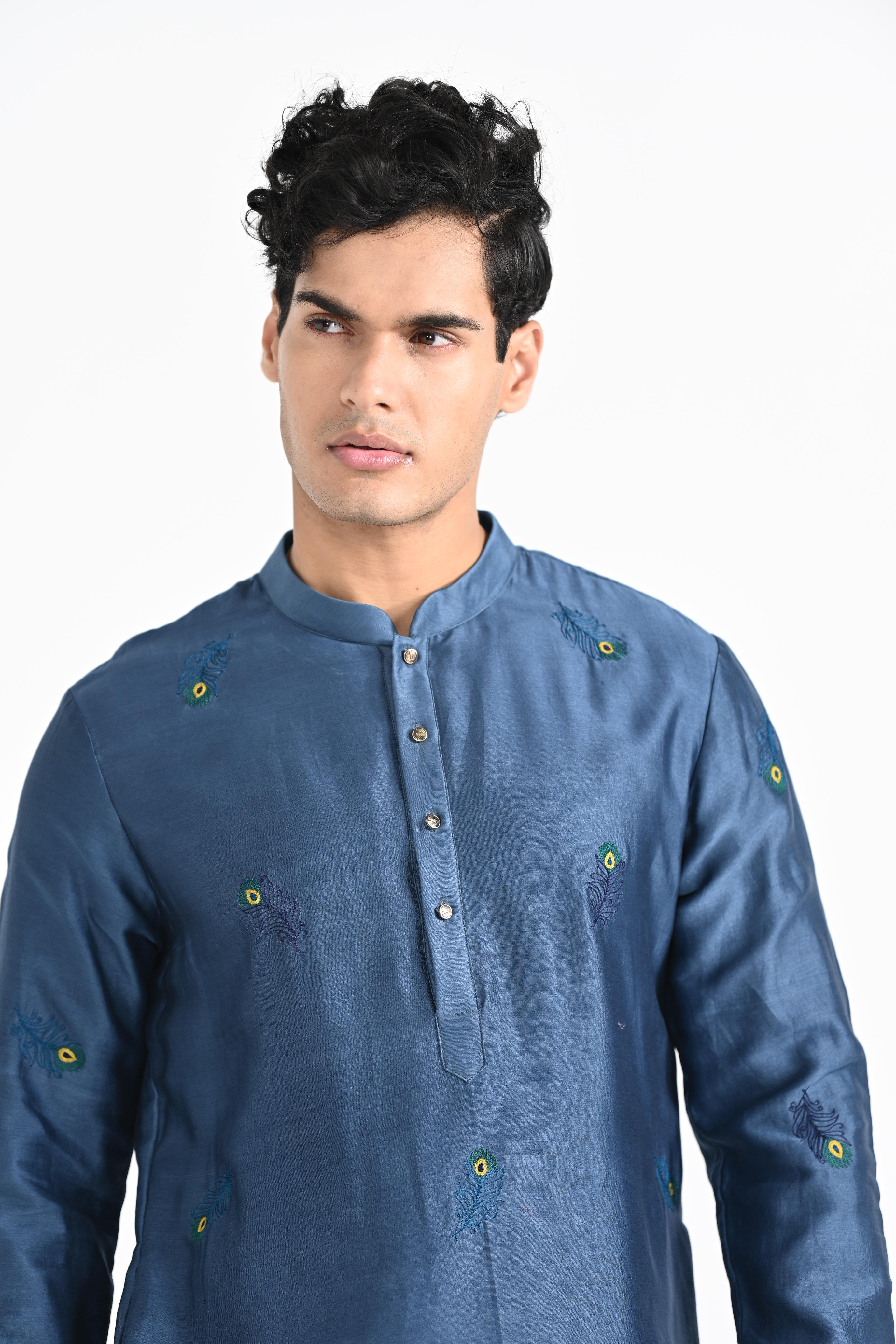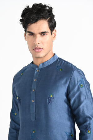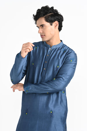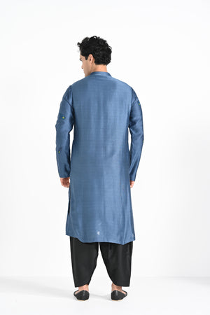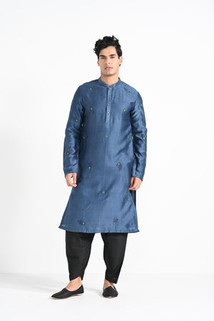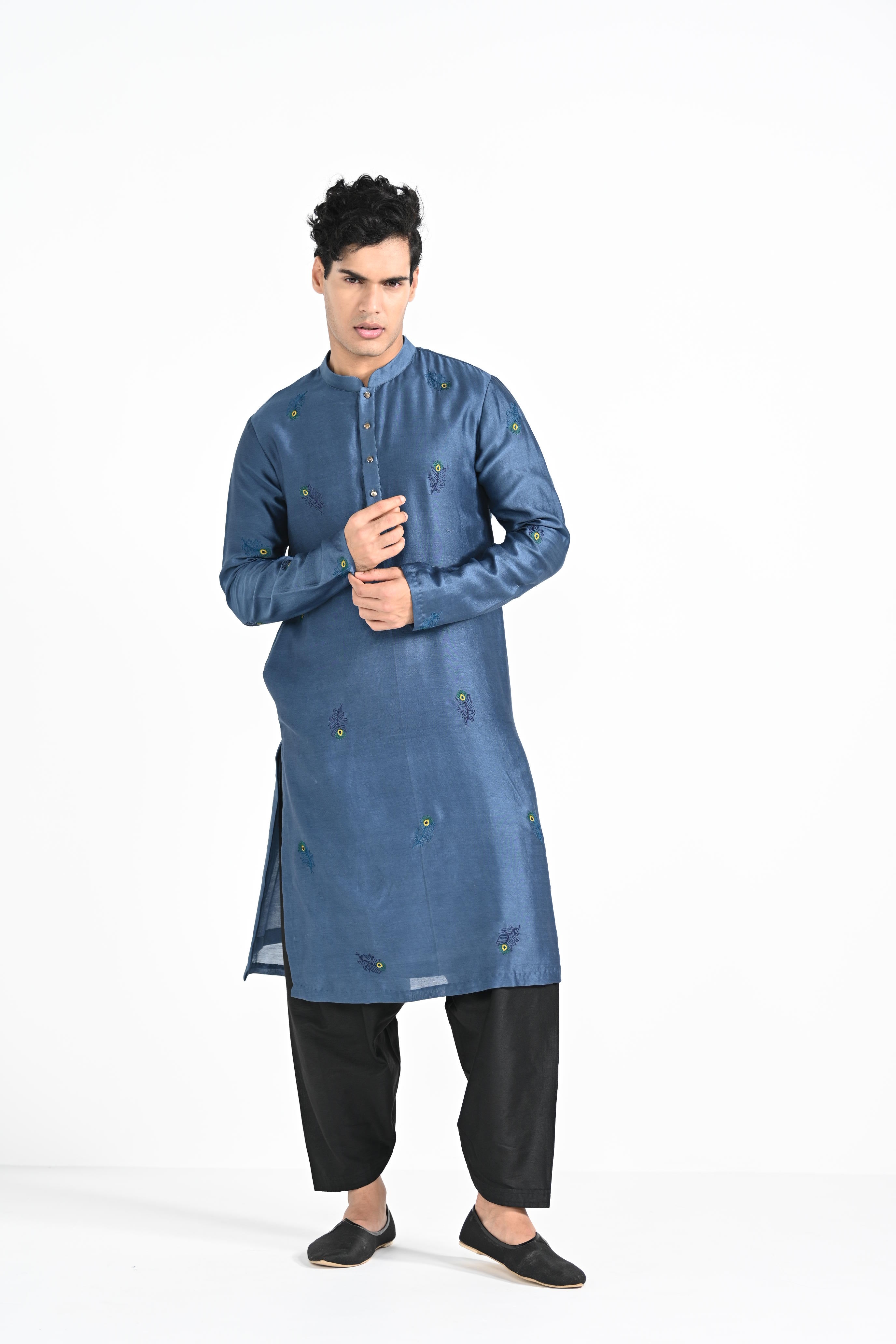 Merlin Blue Thread work embroidered on Chanderi silk.Paired with Black salwar. . Color of the actual garment may vary due to lighting conditions during the shoot .