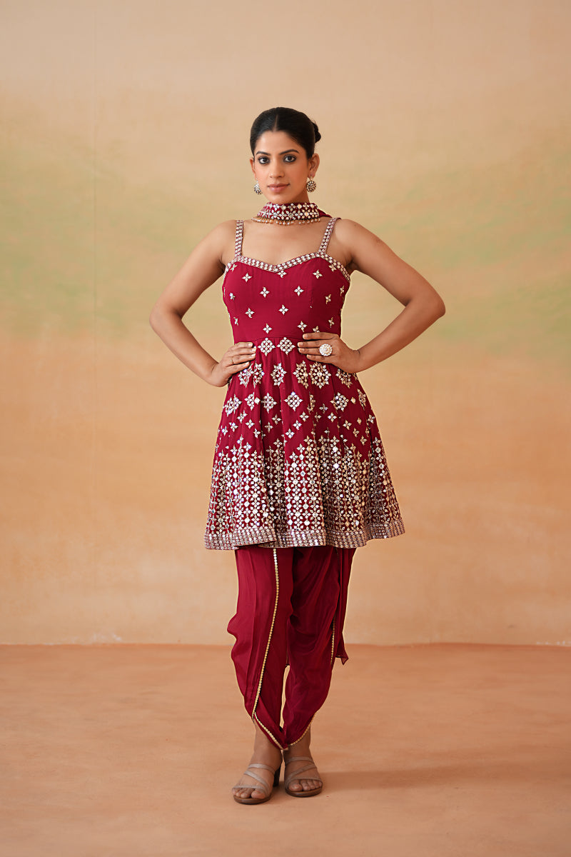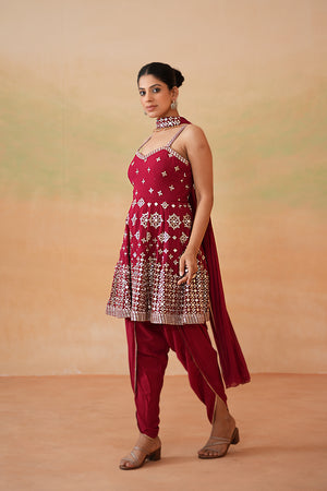 Maroon Embroidery Fabric Peplum Kurti, Tulip Salwar And Choker Dupatta