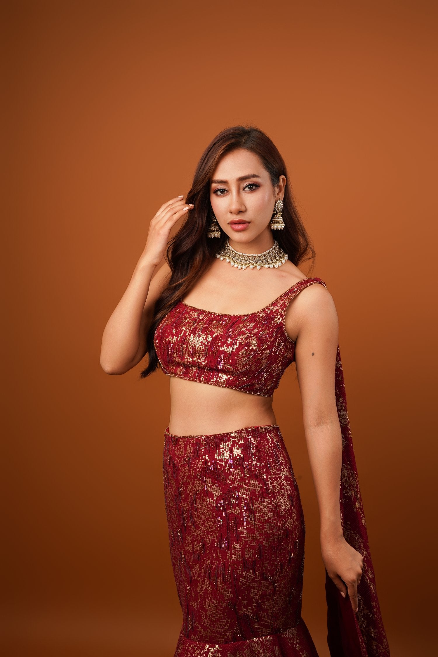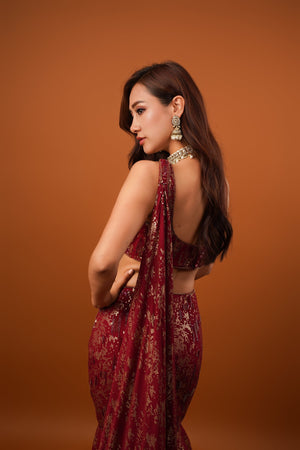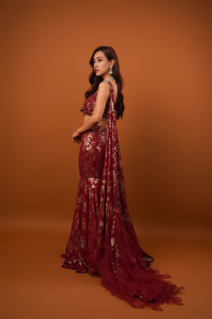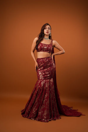 Featuring a maroon mermaid lehenga in georgette base with seuins embroidery. It is paired with a hand embroidered blouse and trail dupatta Accentuate it with statement jewellery and heels for a festive occasion or coctail ceremony.