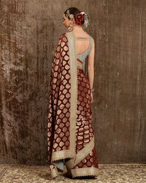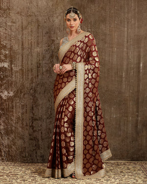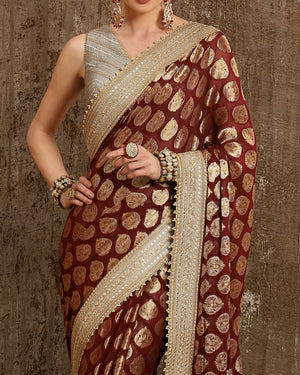 The is a beautiful Maroon Georgette butta saree with exquisite detailing of Dori, Badla and Kasab work. This saree is paired with a Gray Silk Chanderi blouse with Gota work detailing. This blouse beautifully complements the saree providing the outfit a classic look!
