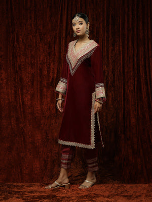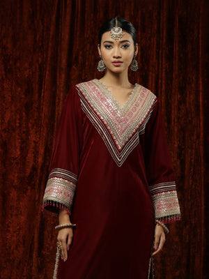 Maroon & Rani Velvet Kurta Pant Set