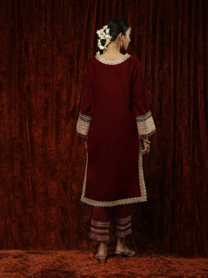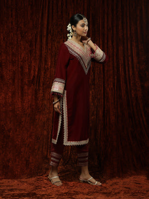 Featuring a Maroon & Rani kurta Pant set in Velvet with dori, badla and kasab work. It is paired with a matching silk chanderi pants having gota detailing