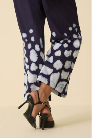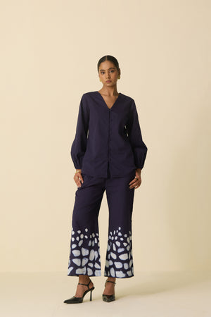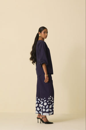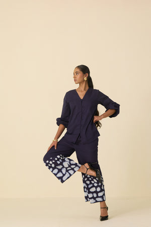 Elevate your summer wardrobe with the Masai Co-ord Set, designed for chic yet easygoing dressing. Crafted from soft twill fabric, the set features a solid blue top with delicate fabric buttons and bishop sleeves for a touch of elegance. Paired with wide-leg pants, adorned with a white giraffe-inspired pattern at the hem, it offers a bold yet refined look. Perfect for travel, casual workdays, or laid-back outings, this set is a go-to for those who love comfort without compromising on style.
