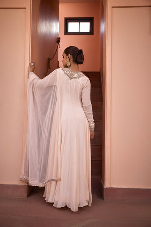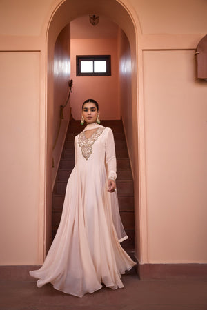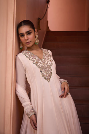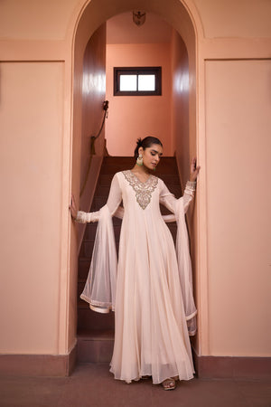 Featuring a timeless white Anarkali gown with intricate dori marodi work embroidered yoke. Paired with an embroidered soft net dupatta.