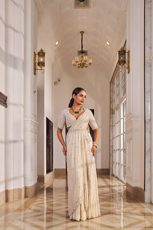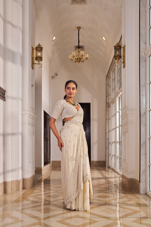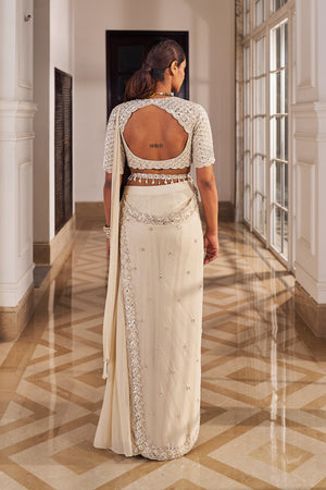 Champagne saree in foil georgette paired with fully embroided V neck blouse in georgette. The outfit is padded with an embellished belt.
