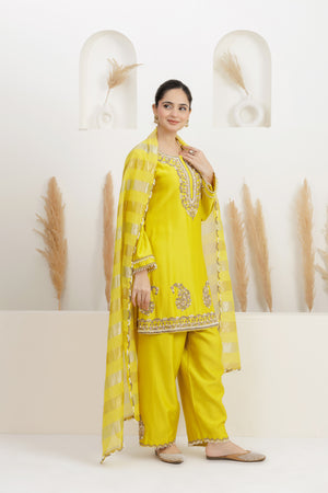 Mastard Yellow Pure Chanderi Silk Embroidered Suit With Pants And Dupatta Set.
