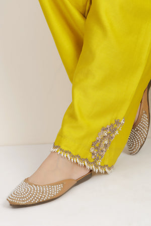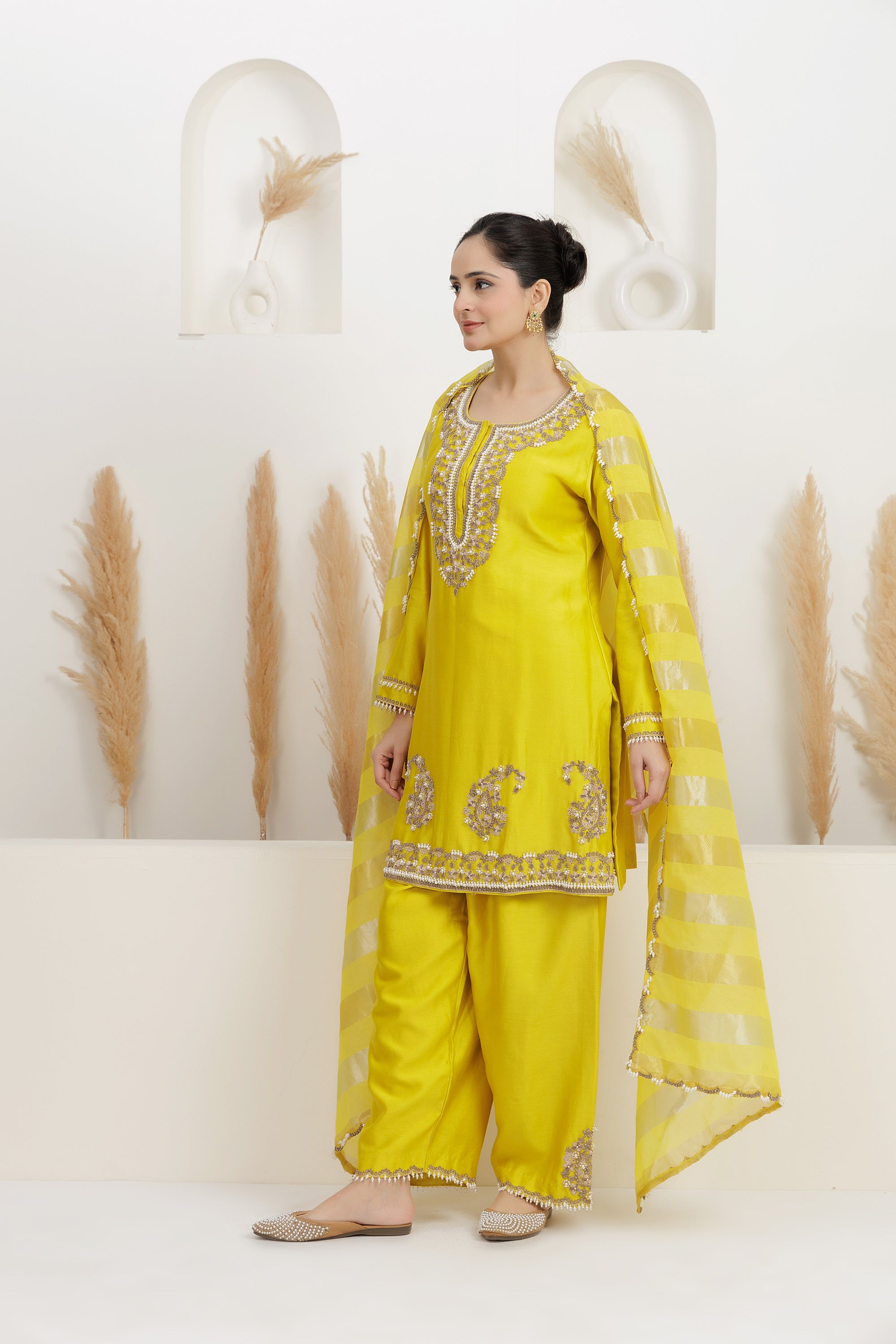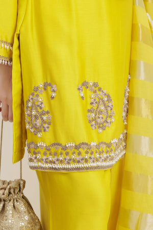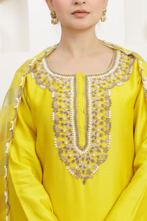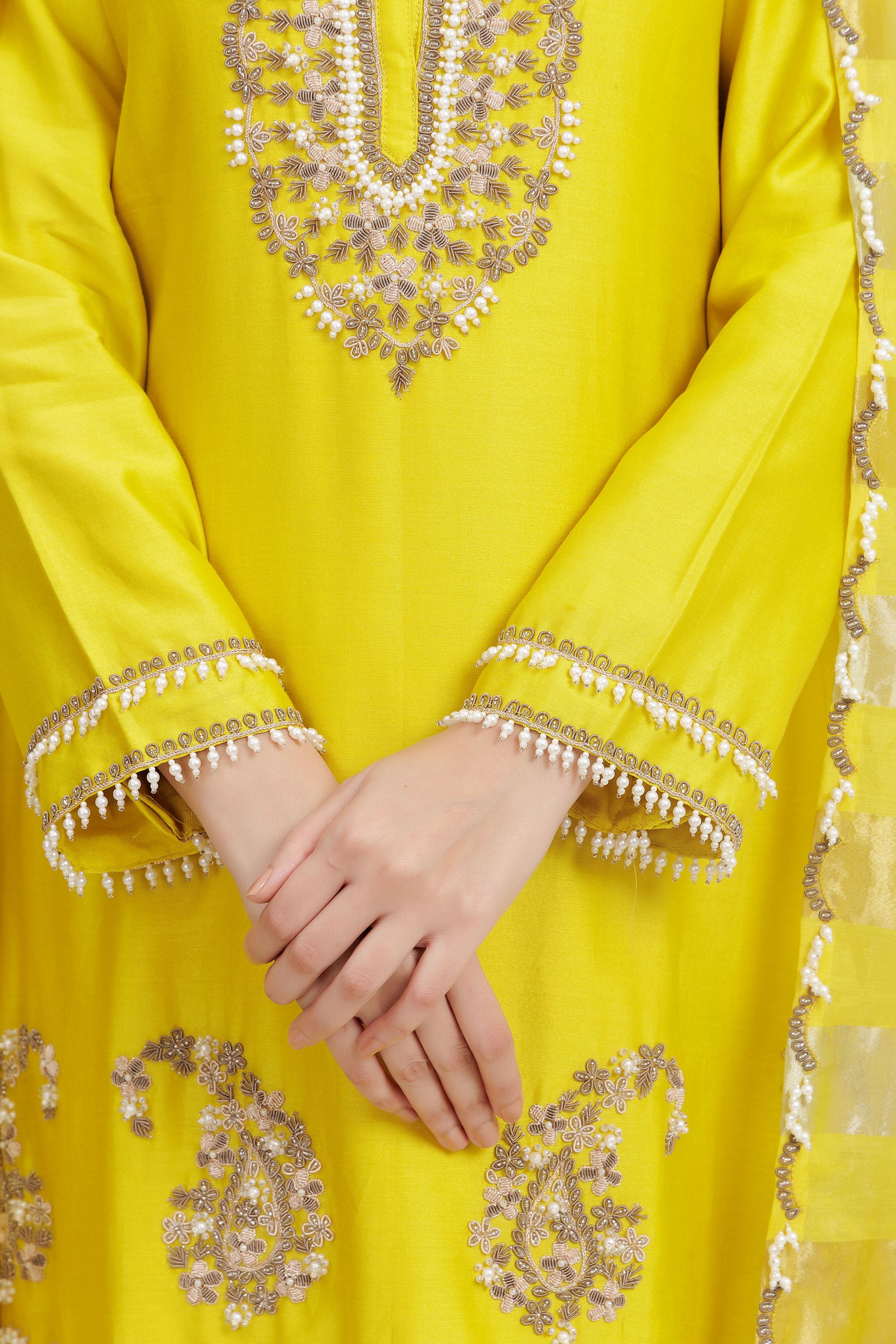 mastard yellow kurta in chanderi silk base with sequins, dabka, pearls, zari, beads, dori embroidery. It is paired with pants and an organza dupatta. Accentuate it with zircon jewellery and heels for a wedding or sangeet ceremony.