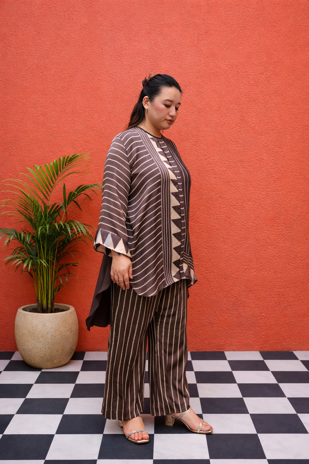A fluid, free-flowing Hi Low top with statement sleeves, showcasing earthy brown and beige stripes accented with geometric triangular motifs. Styled with relaxed, wide-legged pants for a contemporary silhouette and effortless comfort. Model height is 5'5" and is wearing a size L–XL.