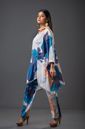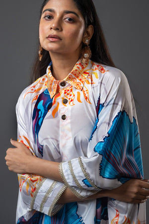 Matsya co-ord set: This ensemble boasts an asymmetrical cut, adorned with embroidered lace, accentuated by embellished broad cuffs and a shirt collar with antique-inspired buttons, paired with a straight pant.