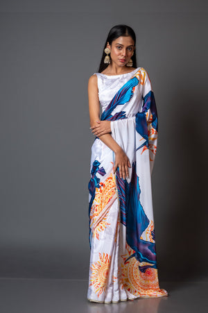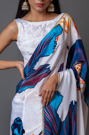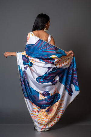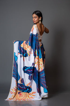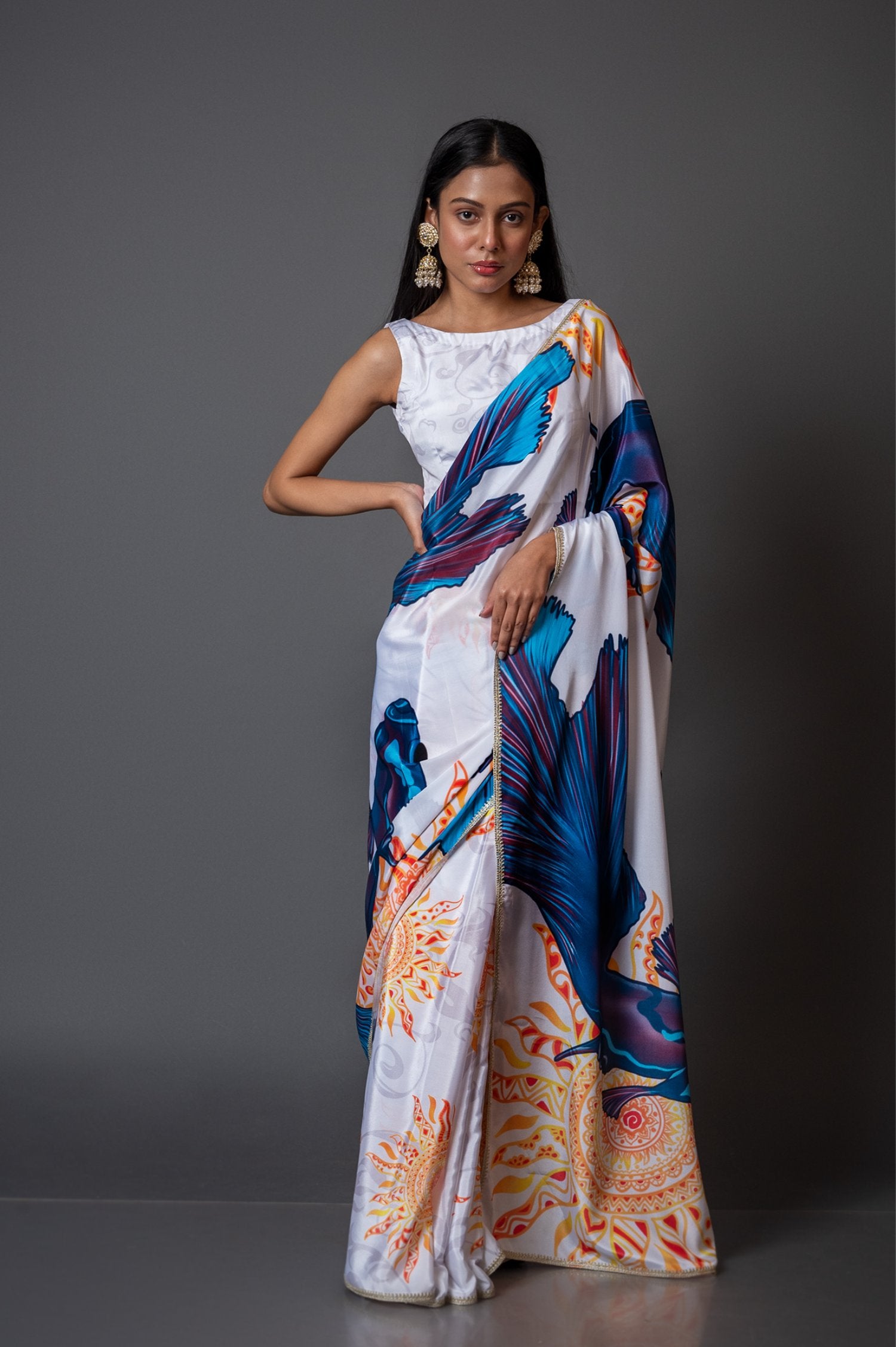 Matsya Saree: A summer delight, this lightweight digital-printed saree exudes comfort, while delicate embroidered lace adds a touch of timeless elegance. Completing with a blouse piece.