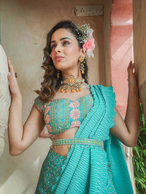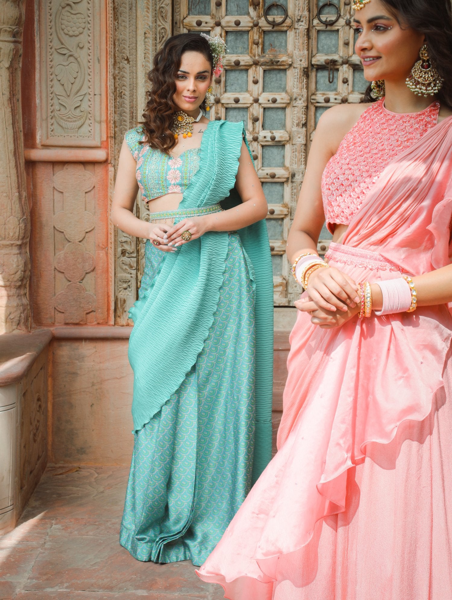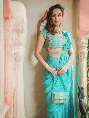 Featuring a Resham, Sequin, Cutdana embroidered and printed blouse in Satin base with printed Satin and Pleated fabric Drape Saree. It comes with an embroidered Belt to enhance the look