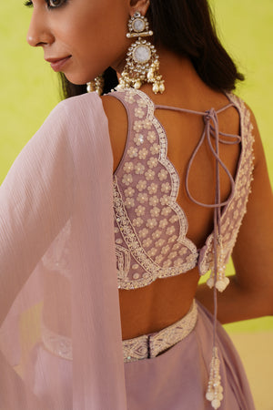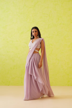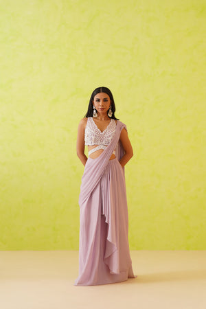 Deepika Chadha's stunning mauve draped saree with an embellished blouse. The blouse is enhanced with white sequins, crystal, stones and pearl embellishments detailing in floral patterns. The saree features a flowy, full-length modern look with a flowy silhouette.