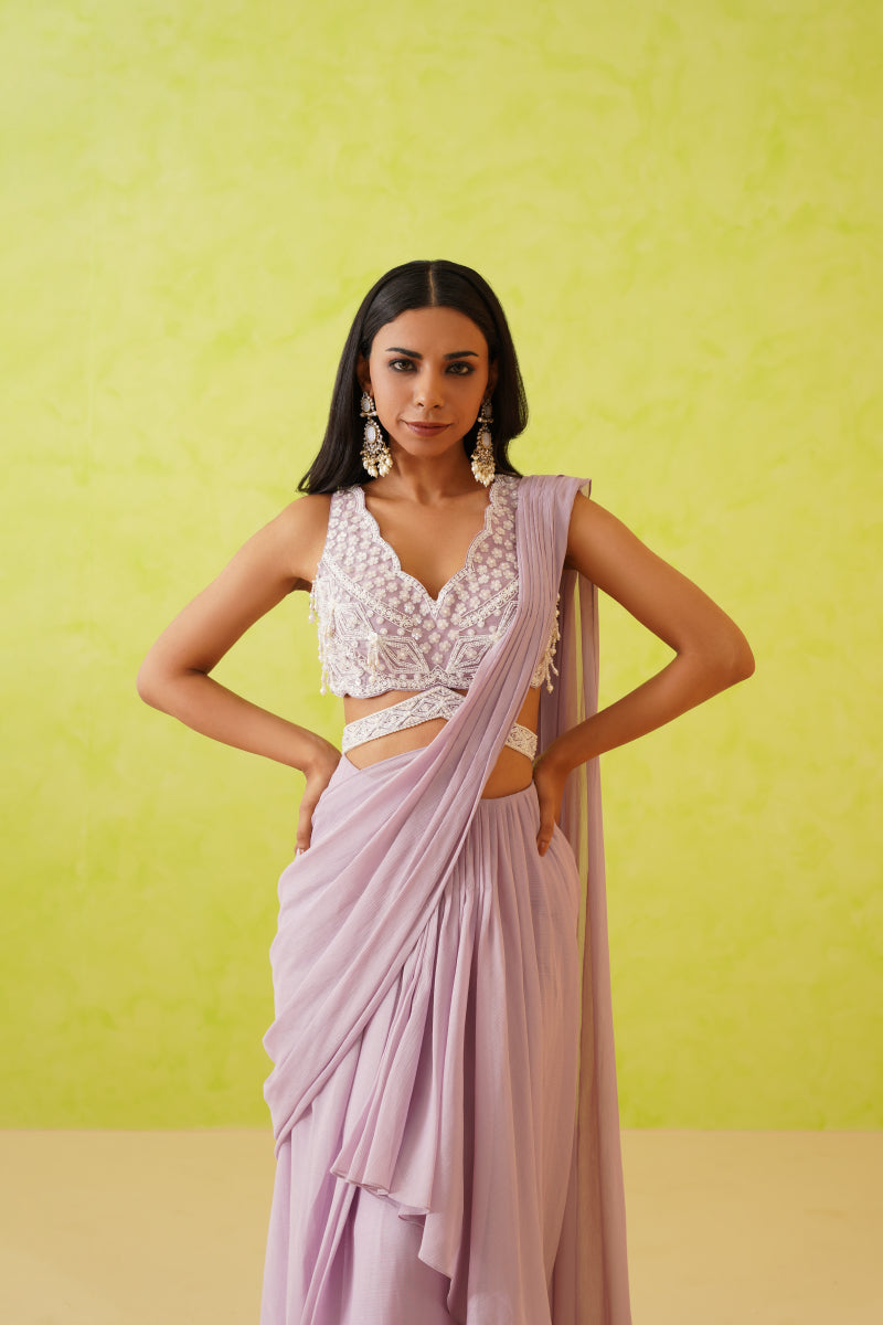 Mauve Drape Saree And Embroidered Blouse Set