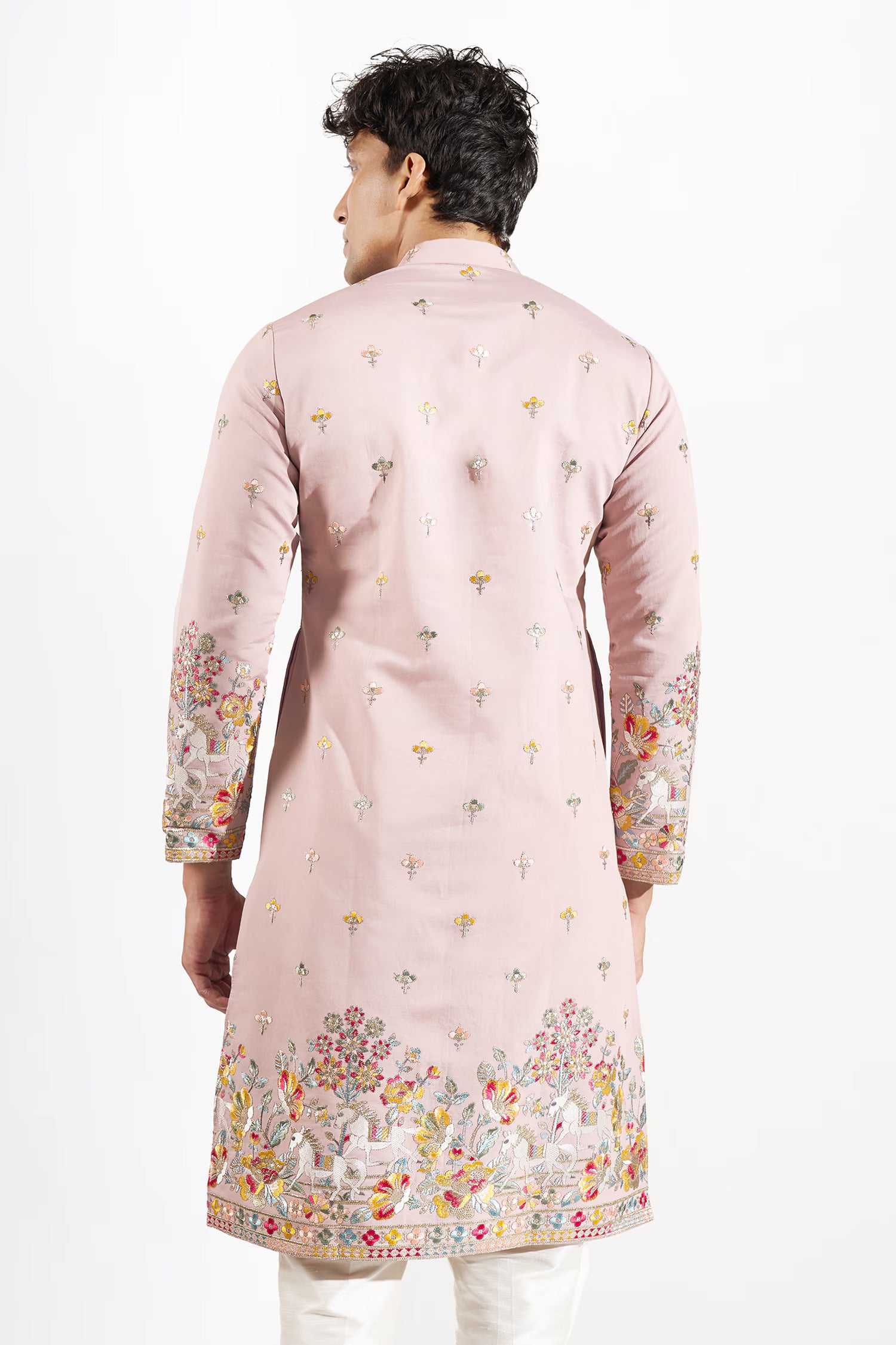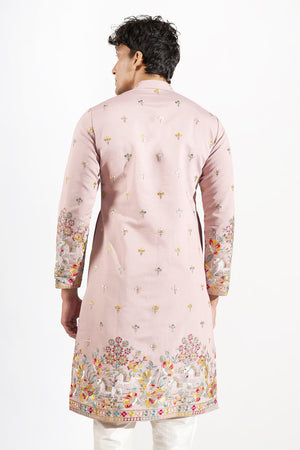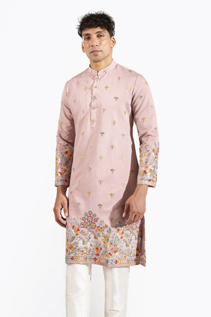 Mauve silk based kurta enhanced with resham and sequins embroidery, paired with an off white dupion silk based pants.