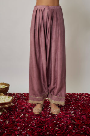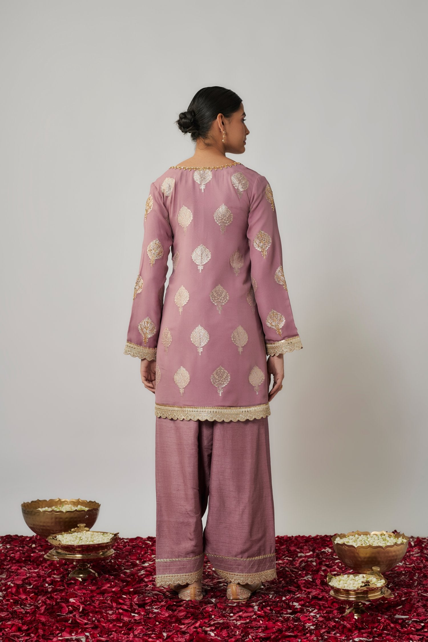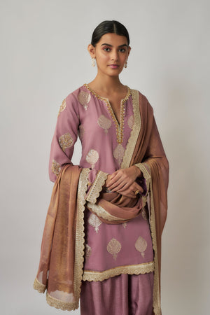 This look features a mauve georgette Benarasi kurta salwar set. The kurta has woven buttas embellished with zari, cutdana and sequins. Teamed with a mauve art dupion silk, khuli salwar. A matching shimmer georgette dupatta with embroidered border completes the look.